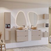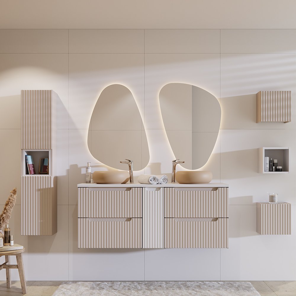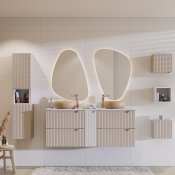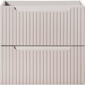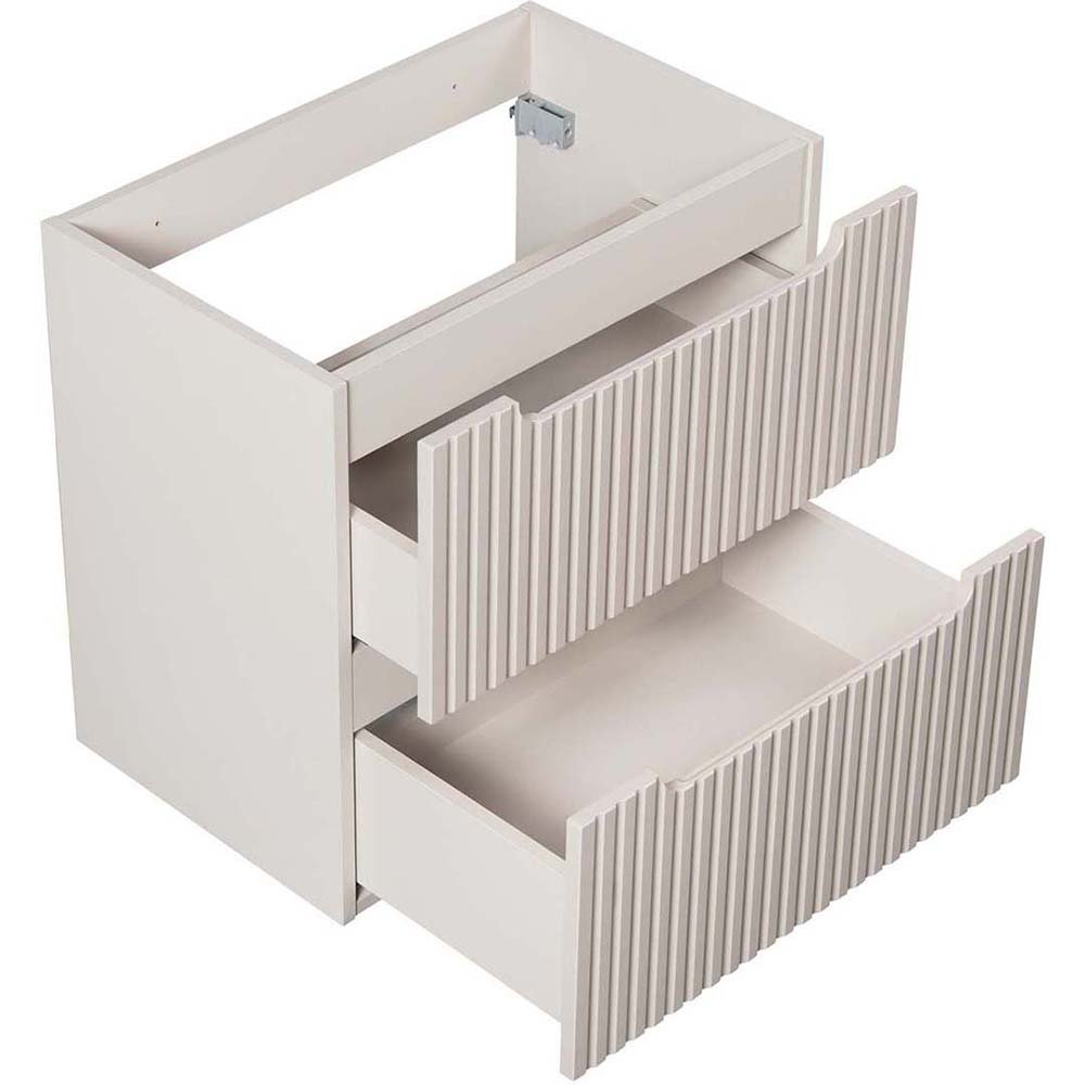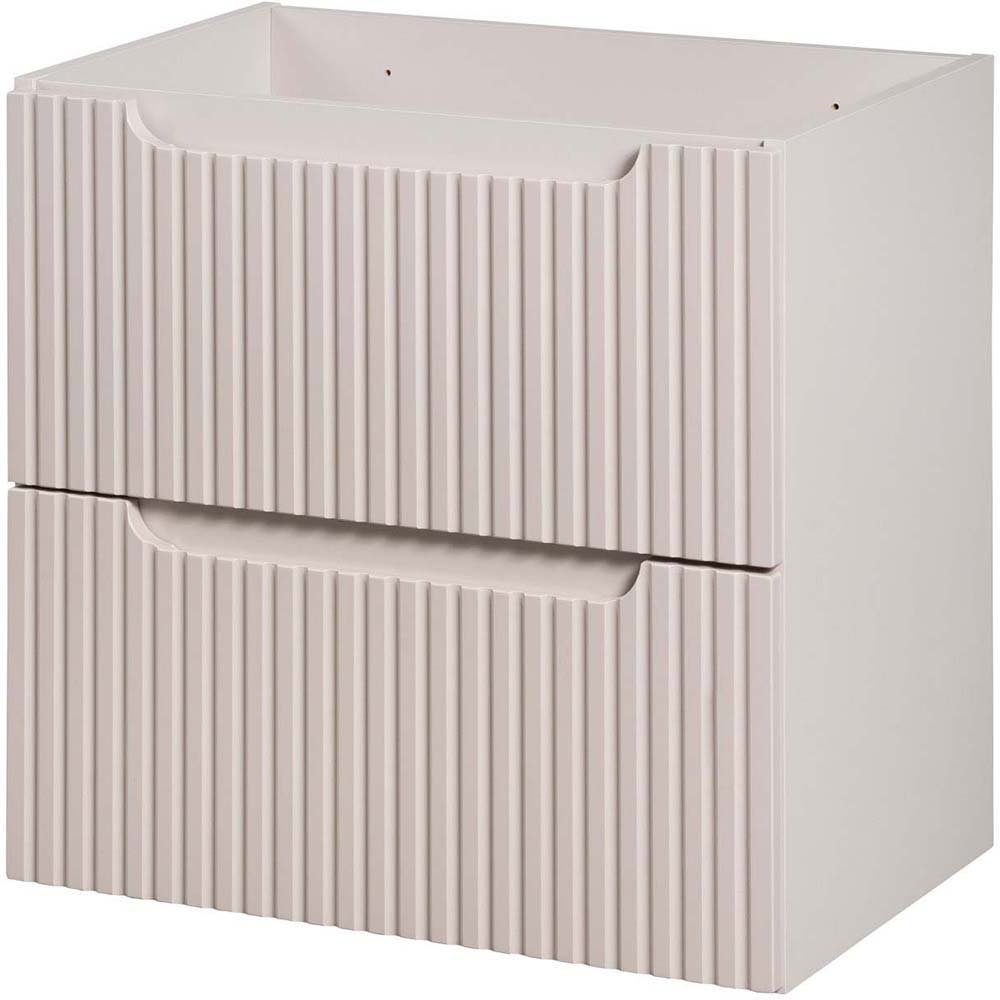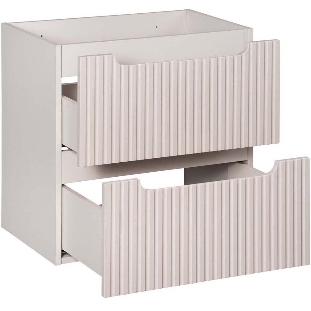 Szafka pod umywalkę 60 cm z dwiema szufladami z kolekcji Nova Cashmere łączy harmonijny, minimalistyczny design z funkcjonalnością, inspirowaną codziennymi potrzebami i trwałymi rozwiązaniami. Pionowe, ryflowane fronty nadają meblom unikalny charakter i optycznie powiększają przestrzeń łazienki, a kaszmirowy kolor dodaje subtelnego ciepła, doskonale komponując się z różnorodnymi aranżacjami wnętrz. Zintegrowane podchwyty nie tylko podkreślają jej styl, ale również wprowadzają spójność wizualną.