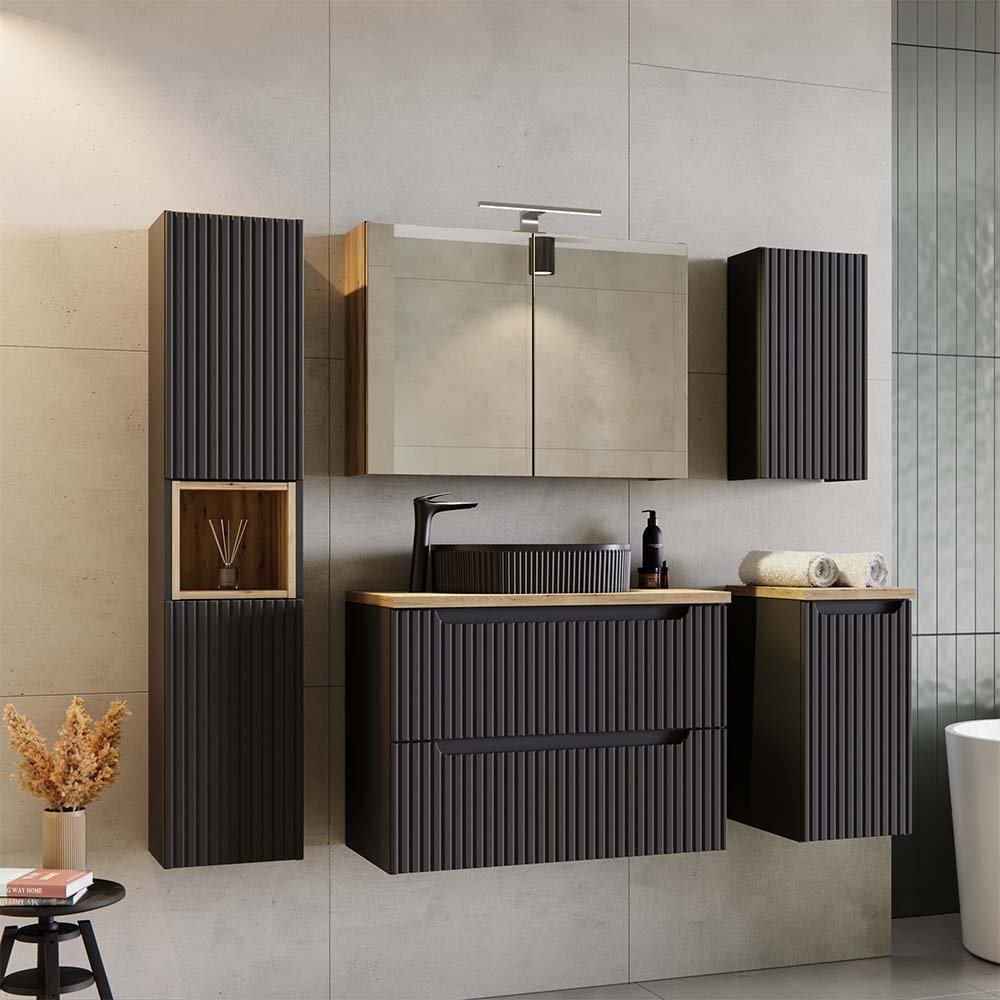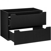 Kolekcja NOVA BLACK to zestawienie klasycznych brył z ryflowanymi frontami wykonanymi z płyty MDF. Zestawy meblowe pasują zarówno do klasycznych, jak i nowoczesnych wnętrz. Przestronne półki i szafki pozwolą utrzymać ład i porządek w łazience.