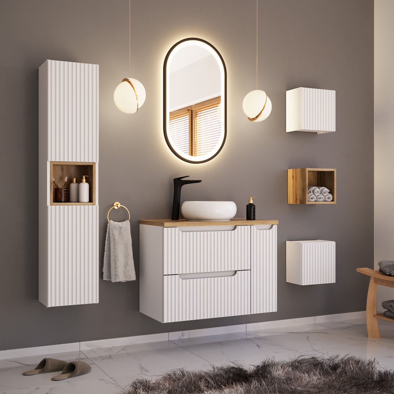 Kolekcja NOVA WHITE to zestawienie klasycznych brył z ryflowanymi frontami wykonanymi z płyty MDF. Zestawy meblowe pasują zarówno do klasycznych, jak i nowoczesnych wnętrz. Przestronne półki i szafki pozwolą utrzymać ład i porządek w łazience.