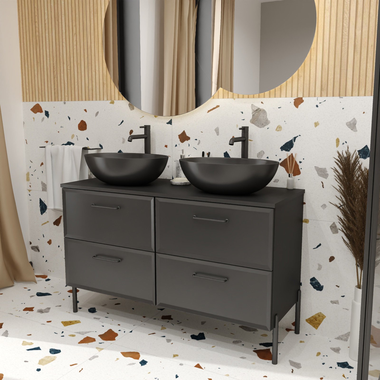 SHELL w kolorze black lava (RAL9005) to umywalka w wyrazistym odcieniu czerni, o aksamitnej w dotyku, matowej powierzchni.