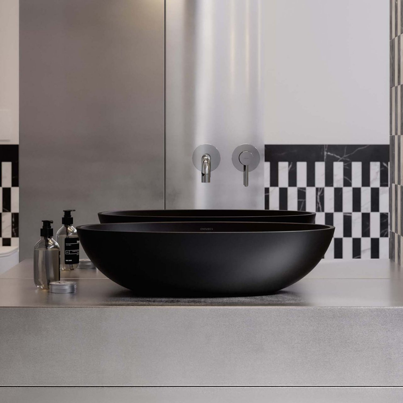 SHELL w kolorze black lava (RAL9005) to umywalka w wyrazistym odcieniu czerni, o aksamitnej w dotyku, matowej powierzchni.