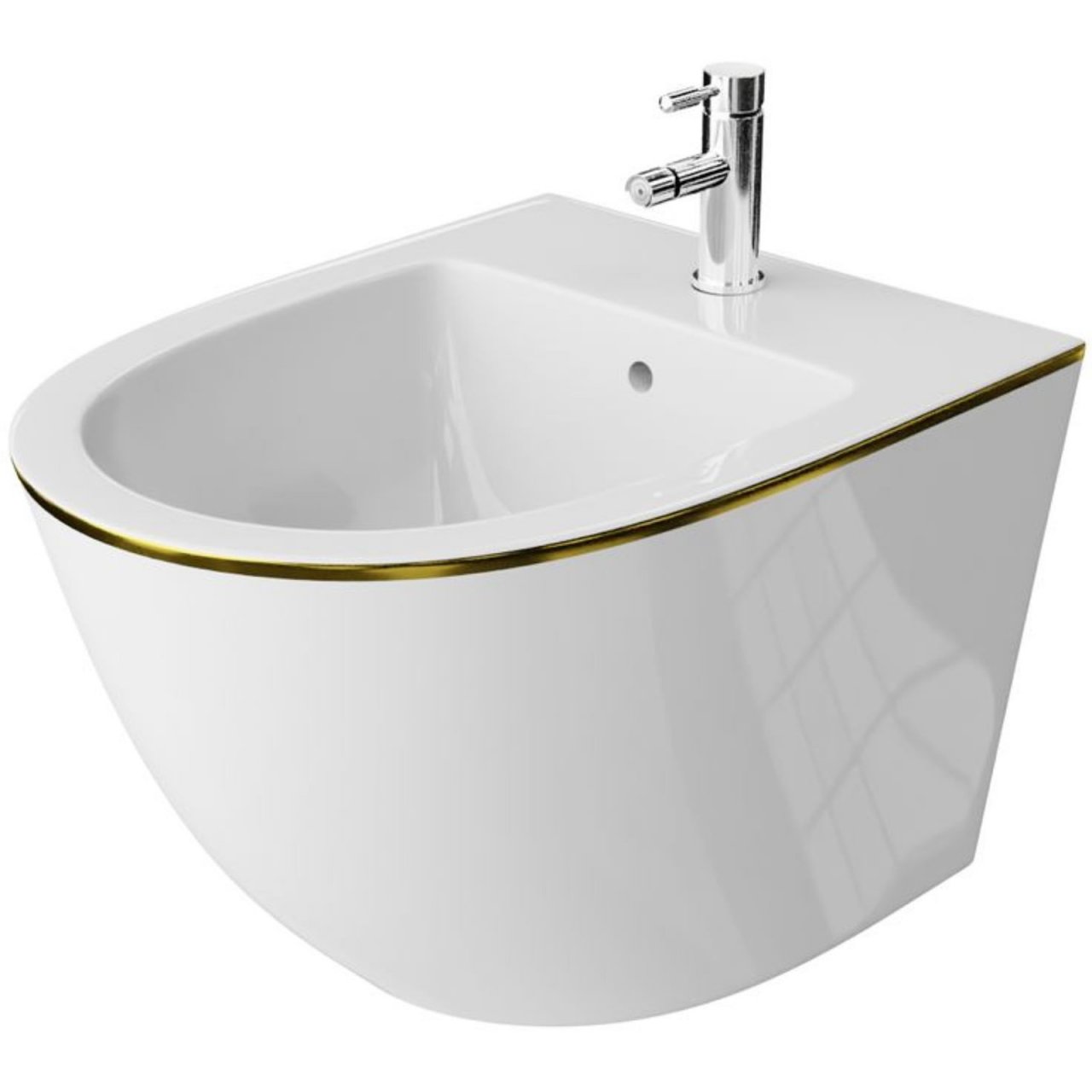 Bidet wiszący SOFI GOLD LINE posiada zaokrąglony kształt, który podkreśla minimalistyczna, złota linia. Dzięki temu modelowi, możesz w subtelny sposób wprowadzić złoty kolor do swojego wnętrza. Bidet SOFI GOLD LINE idealnie sprawdzi się w paryskich, glamour czy nowoczesnych łazienkach. Niepowtarzalny design umocni kwintesencję piękna i harmonii każdego projektu. Model pomoże stworzyć wyjątkową aranżację, która zachwyci każdego użytkownika przemyślaną estetyką.