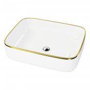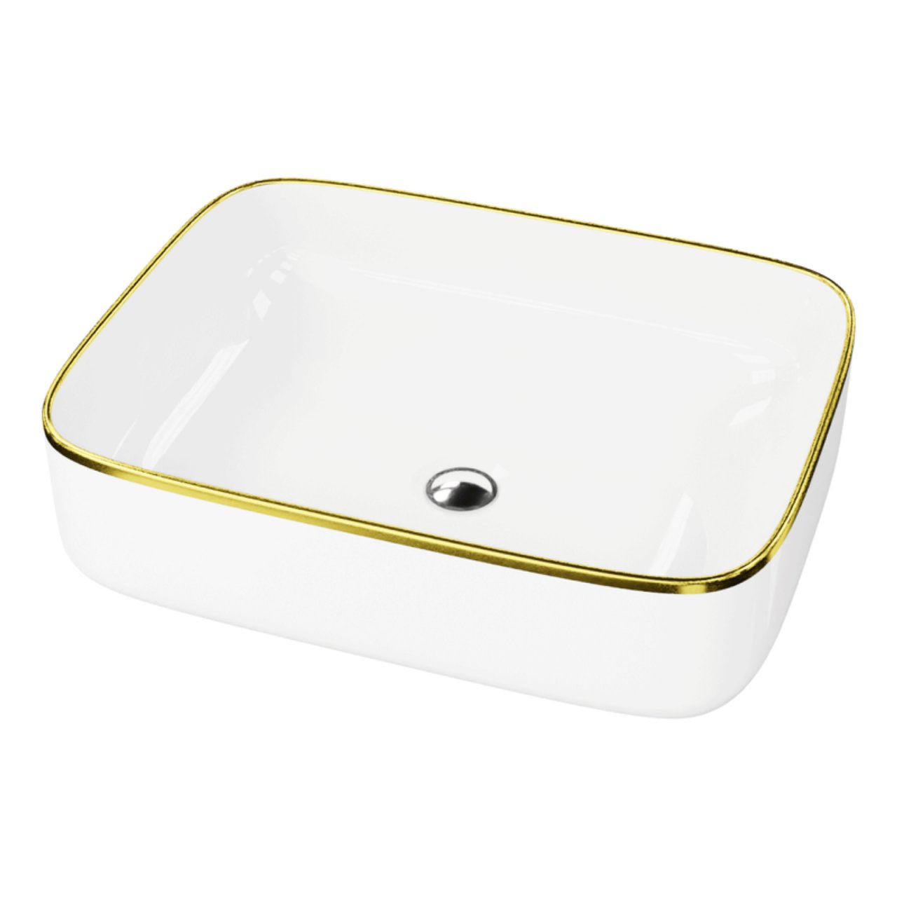 Umywalka nablatowa GALERA GOLD LINE charakteryzuje się prostokątną bryłą i prostymi liniami. Połączenie śnieżnobiałej barwy ze złotym konturem sylwetki jest nietuzinkową propozycją. Umywalka GALERA dedykowana jest do średniej i dużej wielkości blatów łazienkowych. Model idealnie sprawdzi się w klasycznych, skandynawskich i szykownych wnętrzach.