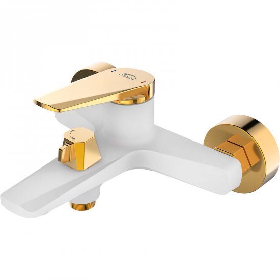 Bateria wannowa Rubio to klasyczny model o ściennym sposobie montażu. Oryginalne połączenie delikatnie spłaszczonego, białego korpusu z elementami w wykończeniu żółtego złota sprawiają, że bateria doskonale sprawdzi się w nowocześnie urządzonych łazienkach. Elegancki styl modelu podkreślony został charakterystycznymi, przypominającymi jubilerskie szlify skosami widocznymi na dźwigni oraz przełączniku funkcji.