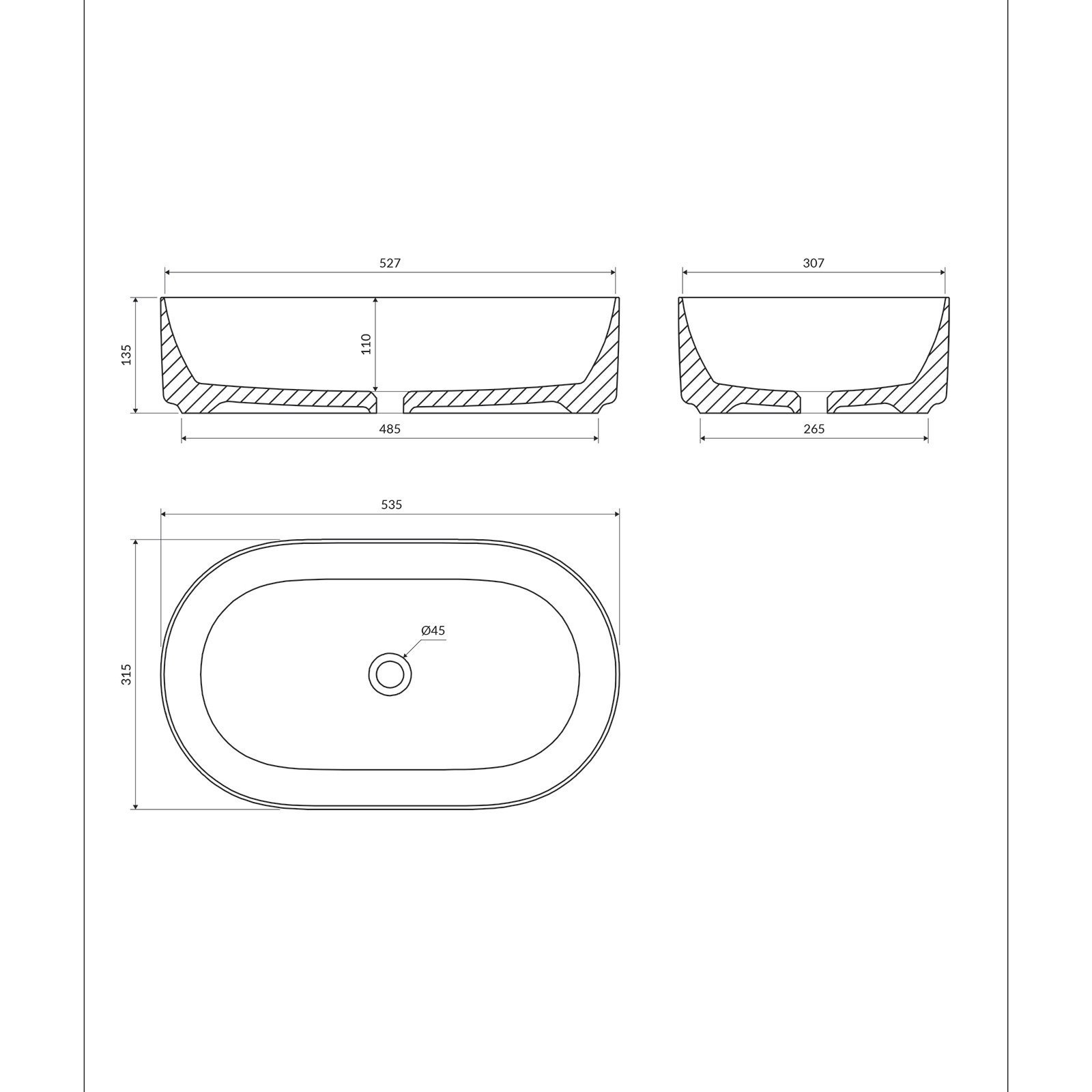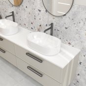 Umywalka nablatowa OMNIRES MESA wyróżnia się geometryczną formą o podłużnym kształcie i symetrycznie zaokrąglonych bokach. Idealnie proste brzegi o wyraźnym konturze nadają bryle wyjątkowo lekki i nowoczesny charakter.