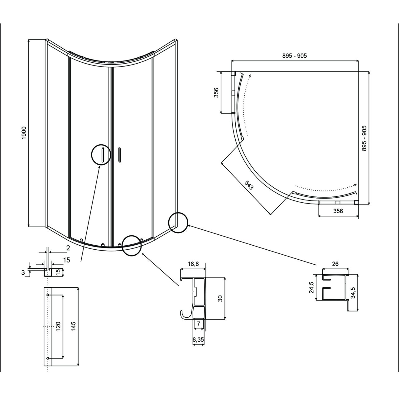 - Drzwi kabiny osadzone są na rolkach łożyskowych w kolorze czarnym w górnej oraz dolnej części;