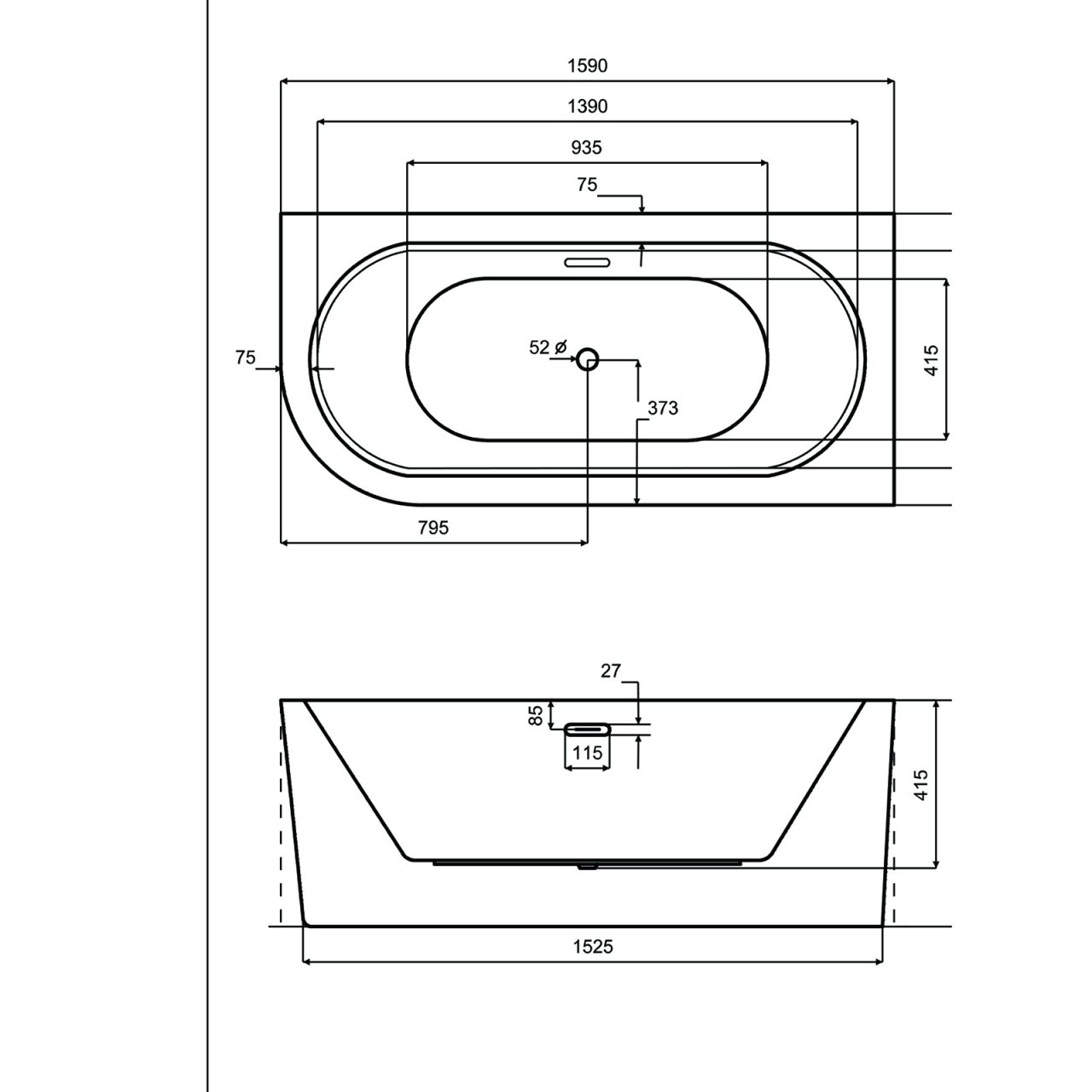 Wanna wolnostojąca AVITA A-LINE przyścienna prawa 160x75 z syfonem białym