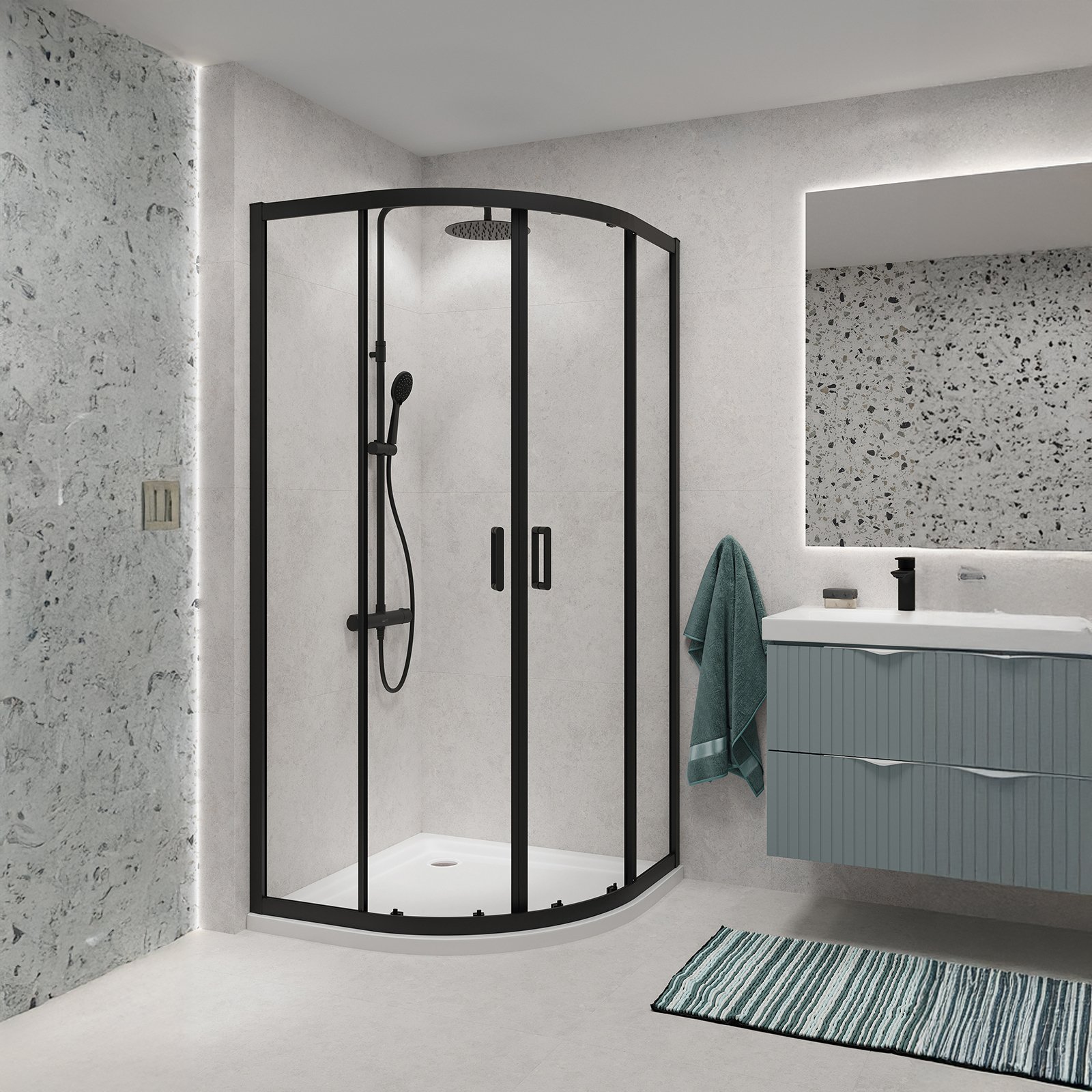 Kabina ARTECO została wykonana z bezpiecznego szkła hartowanego o grubości 5 mm, które zapewnia stabilność konstrukcji oraz gwarantuje bezpieczeństwo użytkowania. Szkło wyposażone jest w ochronną powłokę hydrofobową CleanPro skutecznie zapobiegającą osadzaniu się kamienia oraz zanieczyszczeń, co pozwala na łatwiejsze utrzymanie kabiny w czystości. W kabinie zastosowano system z drzwiami przesuwnymi, z podwójnymi rolkami chromowanymi u góry i na dole, co zapewnia płynne otwieranie i zamykanie drzwi. Funkcja szybkiego wypinania dolnych rolek pozwala na łatwe zdjęcie drzwi kabiny. Kabina wyposażona jest także w funkcjonalny profil przyścienny dostosowujący się do nierówności ściany w zakresie do 15 mm. Dwustronne uchwyty z wysokiej jakości metalu łączą w sobie trwałość i funkcjonalność. Kabina półokrągła narożna, o wysokości 190 cm, szerokości 80 cm, ze szkłem transperentnym. Profile w kolorze czarnym. Kabina przeznaczona do montażu z brodzikiem lub bezpośrednio na posadzce. Do kompletowania z kabiną dostępna jest szeroka oferta odpływów liniowych oraz brodzików prysznicowych w różnej kolorystyce i wysokości co umożliwia swobodę konfiguracji.Wysoką jakość produktu potwierdza długoletnia gwarancja.