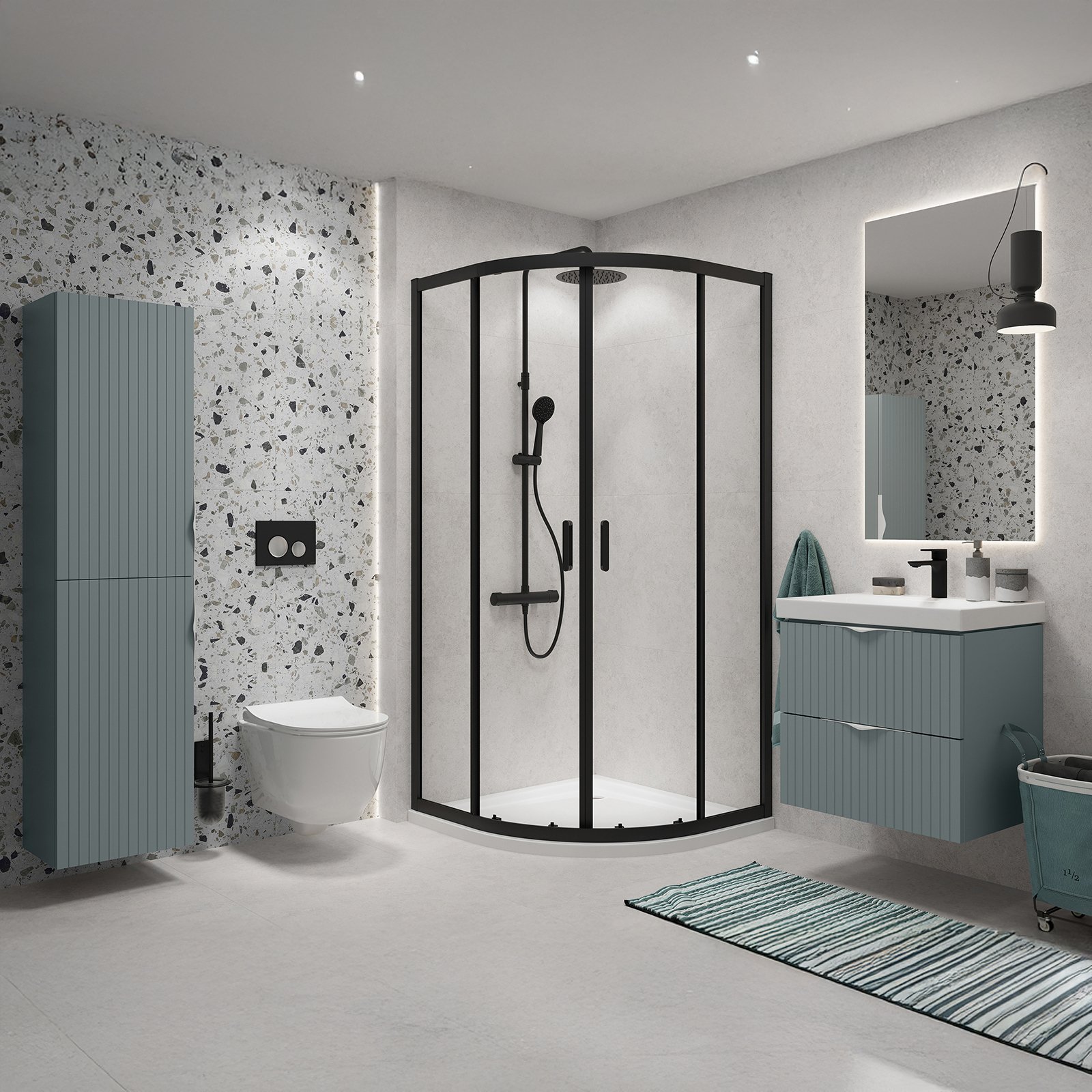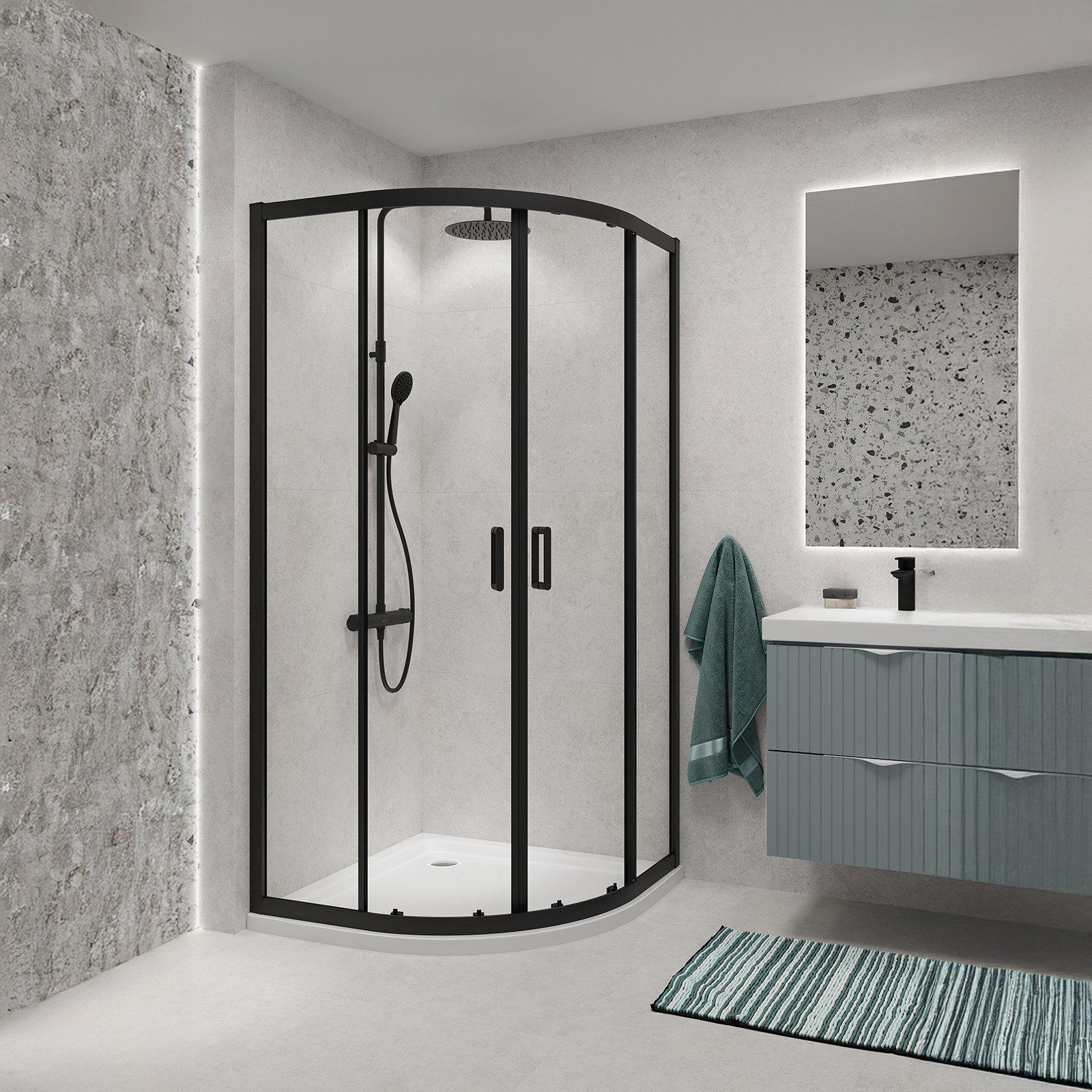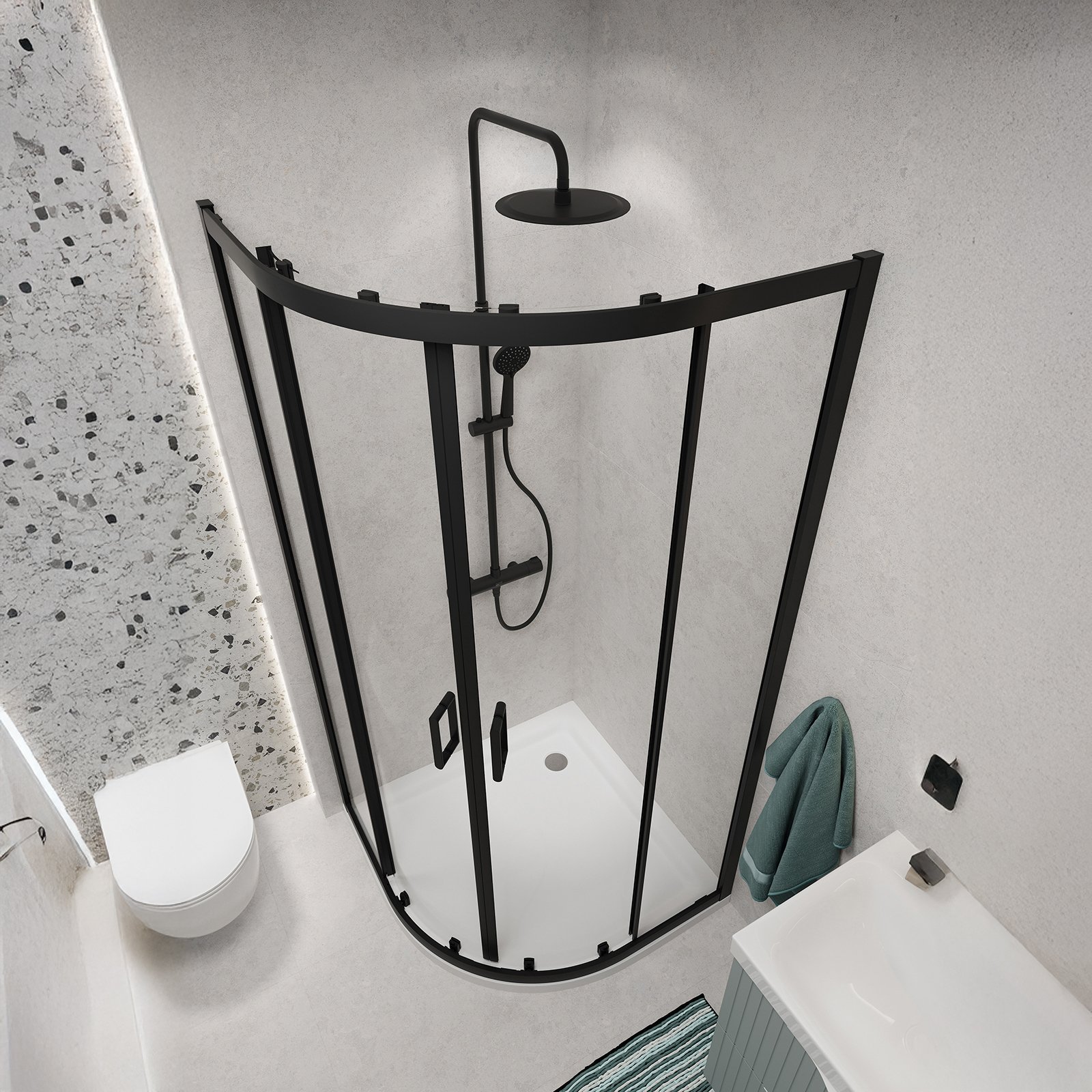 Kabina ARTECO została wykonana z bezpiecznego szkła hartowanego o grubości 5 mm, które zapewnia stabilność konstrukcji oraz gwarantuje bezpieczeństwo użytkowania. Szkło wyposażone jest w ochronną powłokę hydrofobową CleanPro skutecznie zapobiegającą osadzaniu się kamienia oraz zanieczyszczeń, co pozwala na łatwiejsze utrzymanie kabiny w czystości. W kabinie zastosowano system z drzwiami przesuwnymi, z podwójnymi rolkami chromowanymi u góry i na dole, co zapewnia płynne otwieranie i zamykanie drzwi. Funkcja szybkiego wypinania dolnych rolek pozwala na łatwe zdjęcie drzwi kabiny. Kabina wyposażona jest także w funkcjonalny profil przyścienny dostosowujący się do nierówności ściany w zakresie do 15 mm. Dwustronne uchwyty z wysokiej jakości metalu łączą w sobie trwałość i funkcjonalność. Kabina półokrągła narożna, o wysokości 190 cm, szerokości 90 cm, ze szkłem transperentnym. Profile w kolorze czarnym. Kabina przeznaczona do montażu z brodzikiem lub bezpośrednio na posadzce. Do kompletowania z kabiną dostępna jest szeroka oferta odpływów liniowych oraz brodzików prysznicowych w różnej kolorystyce i wysokości co umożliwia swobodę konfiguracji. Wysoką jakość produktu potwierdza długoletnia gwarancja.