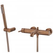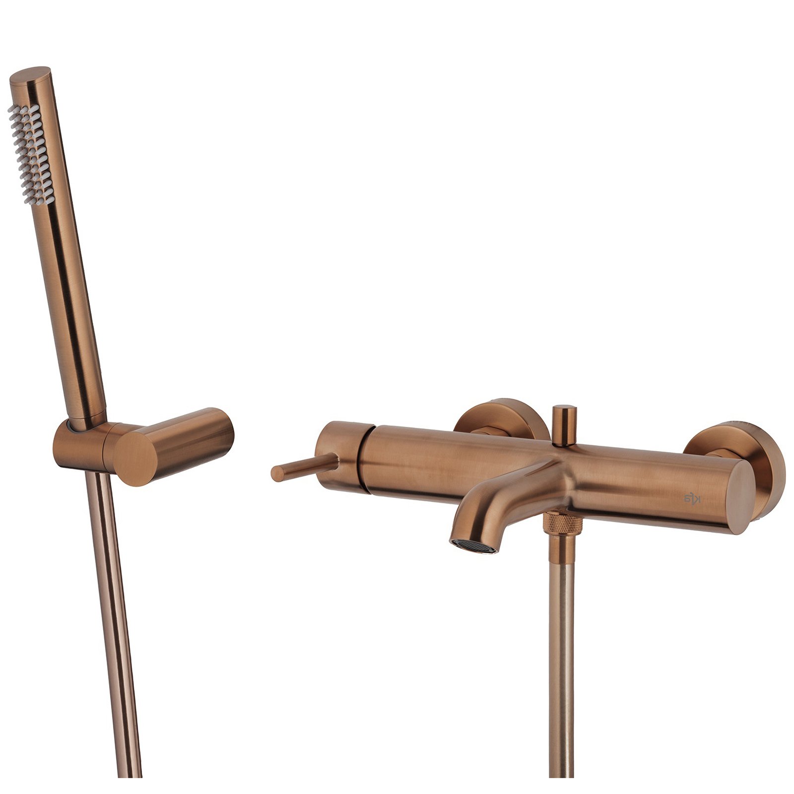 Bateria wannowa MOZA ścienna pozioma, zestaw natryskowy premium różowa złota szczotkowana PVD.