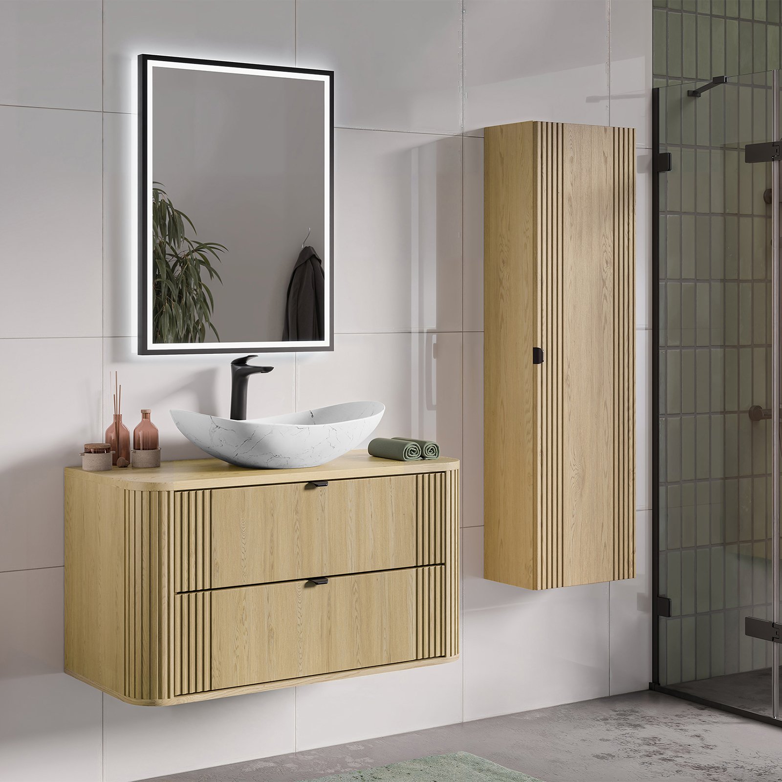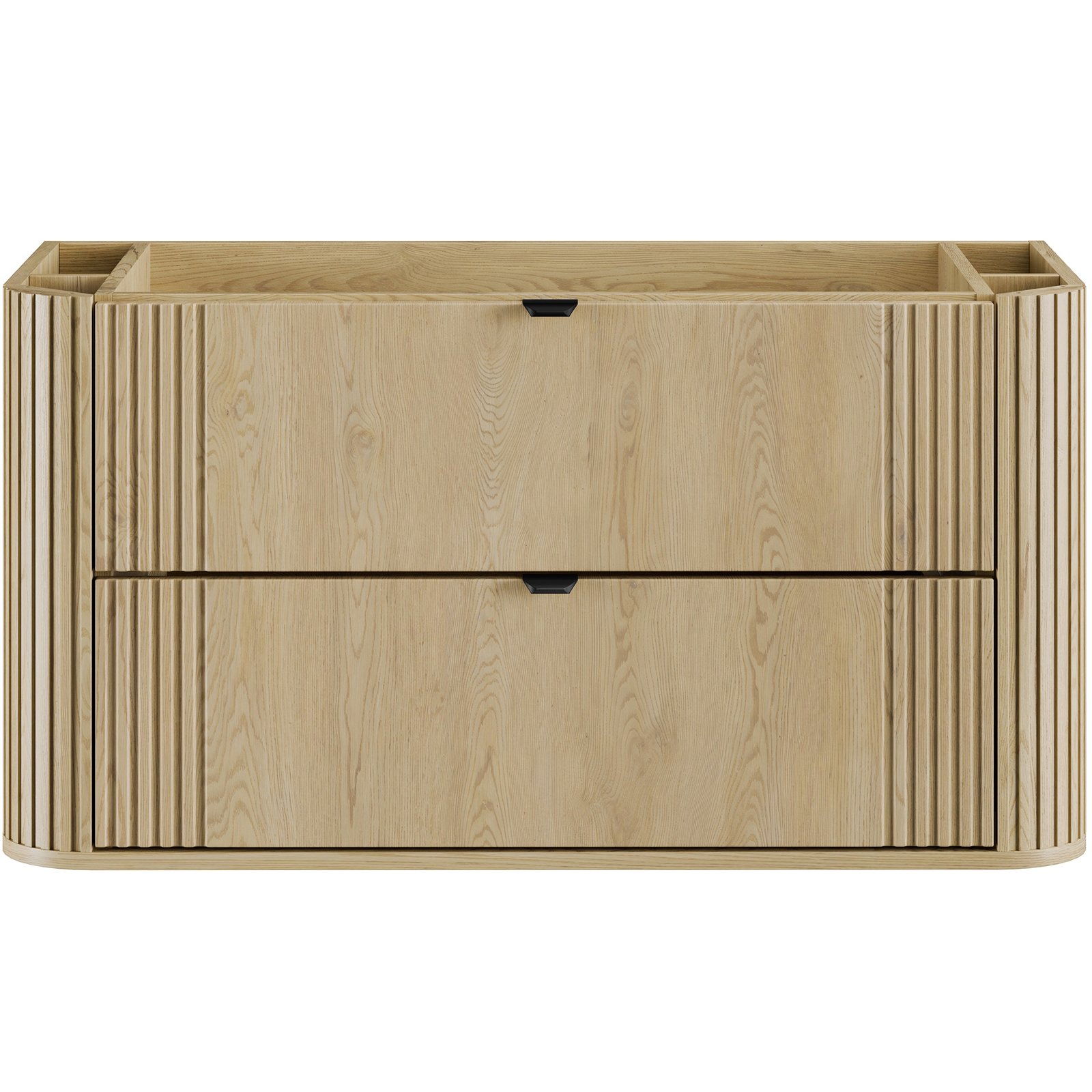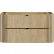 Szafka pod umywalkę 100 cm z dwiema szufladami z kolekcji Ovalia Cremona to wyrazisty akcent we wnętrzu – unikalne połączenie subtelności i charakteru, które natychmiast przyciąga wzrok. Charakterystyczne zaokrąglone rogi szafek, dodają bryłom wizualnej lekkości, a wyraziste, pionowe ryflowania – obecne zarówno po bokach frontów, jak i na zaokrągleniach – podkreślają ich wyjątkową formę. Ciepły dekor Dąb Cremona odwzorowuje naturalne piękno drewna, tworząc przytulną atmosferę, a smukłe, czarne uchwyty z metalu wprowadzają interesujący kontrast i nadają eleganckiego wykończenia.