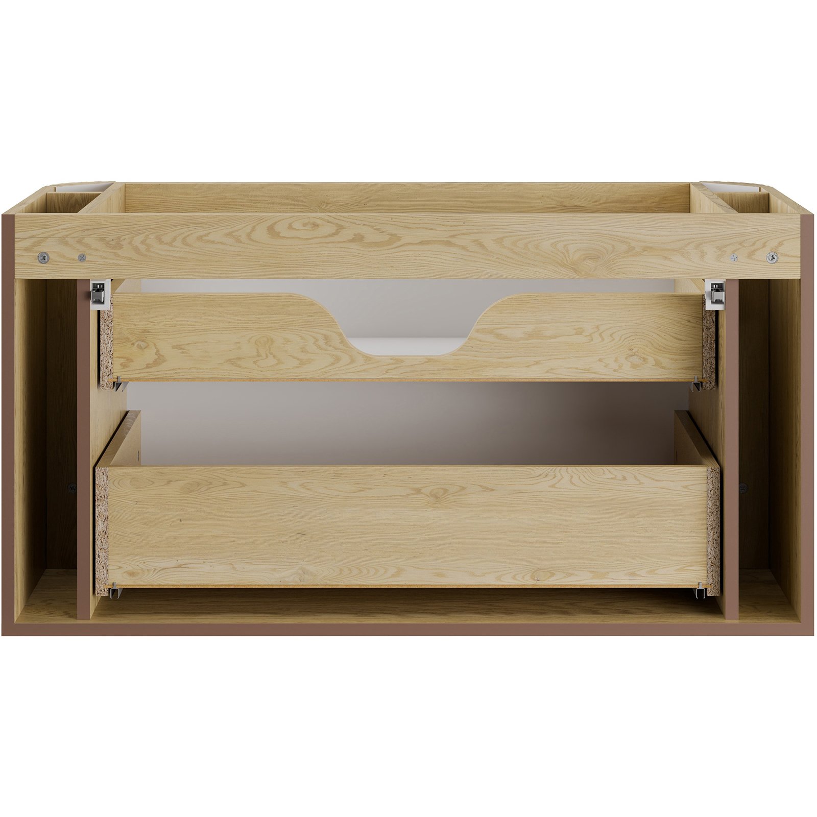 Dwie szuflady oferują dużą miejsca do przechowywania akcesoriów łazienkowych, utrzymując porządek. Meble zostały wykonane z płyty MDF i płyty laminowanej zapewniając estetyczny wygląd na lata. Komfort codziennego użytkowania podnosi system cichego domykania, który sprawia, że otwieranie i zamykanie frontów jest płynne i bezgłośne. Szafki pod umywalkę o głębokości 46 cm łączą funkcjonalność z unikalną formą, a dzięki dedykowanym, zaokrąglonym umywalkom Pure oraz dopasowanym blatom tworzą kompletne, gotowe rozwiązanie.