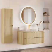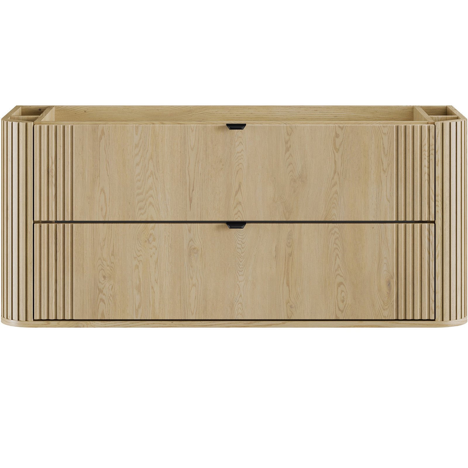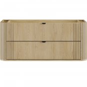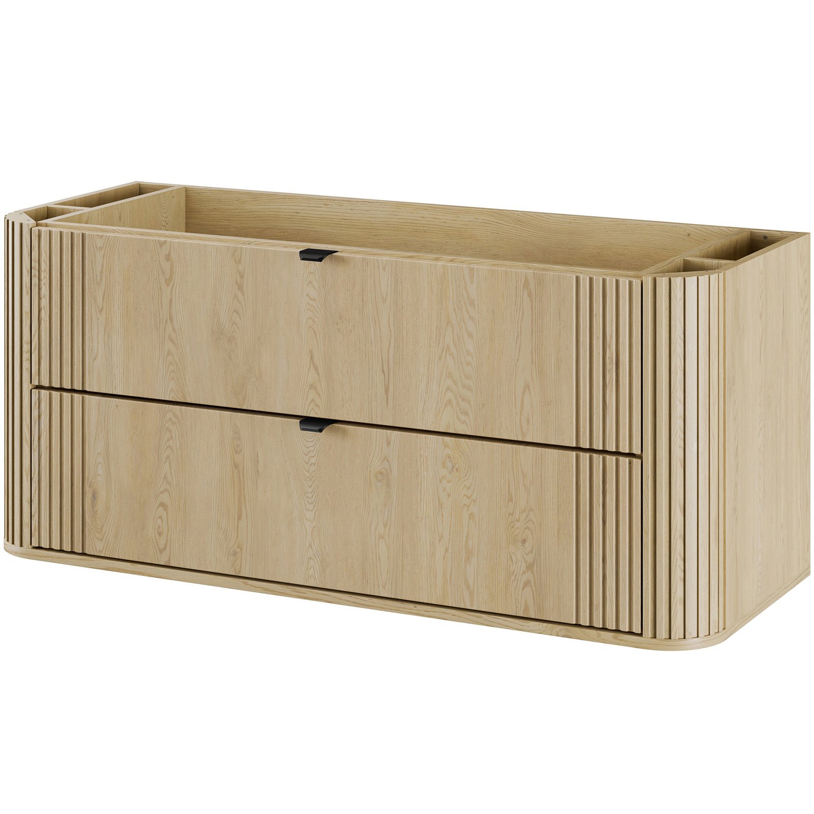 Szafka pod umywalkę 120 cm z dwiema szufladami z kolekcji Ovalia Cremona to wyrazisty akcent we wnętrzu – unikalne połączenie subtelności i charakteru, które natychmiast przyciąga wzrok. Charakterystyczne zaokrąglone rogi szafek, dodają bryłom wizualnej lekkości, a wyraziste, pionowe ryflowania – obecne zarówno po bokach frontów, jak i na zaokrągleniach – podkreślają ich wyjątkową formę. Ciepły dekor Dąb Cremona odwzorowuje naturalne piękno drewna, tworząc przytulną atmosferę, a smukłe, czarne uchwyty z metalu wprowadzają interesujący kontrast i nadają eleganckiego wykończenia.