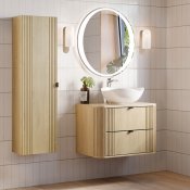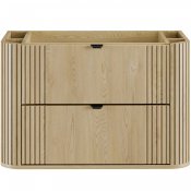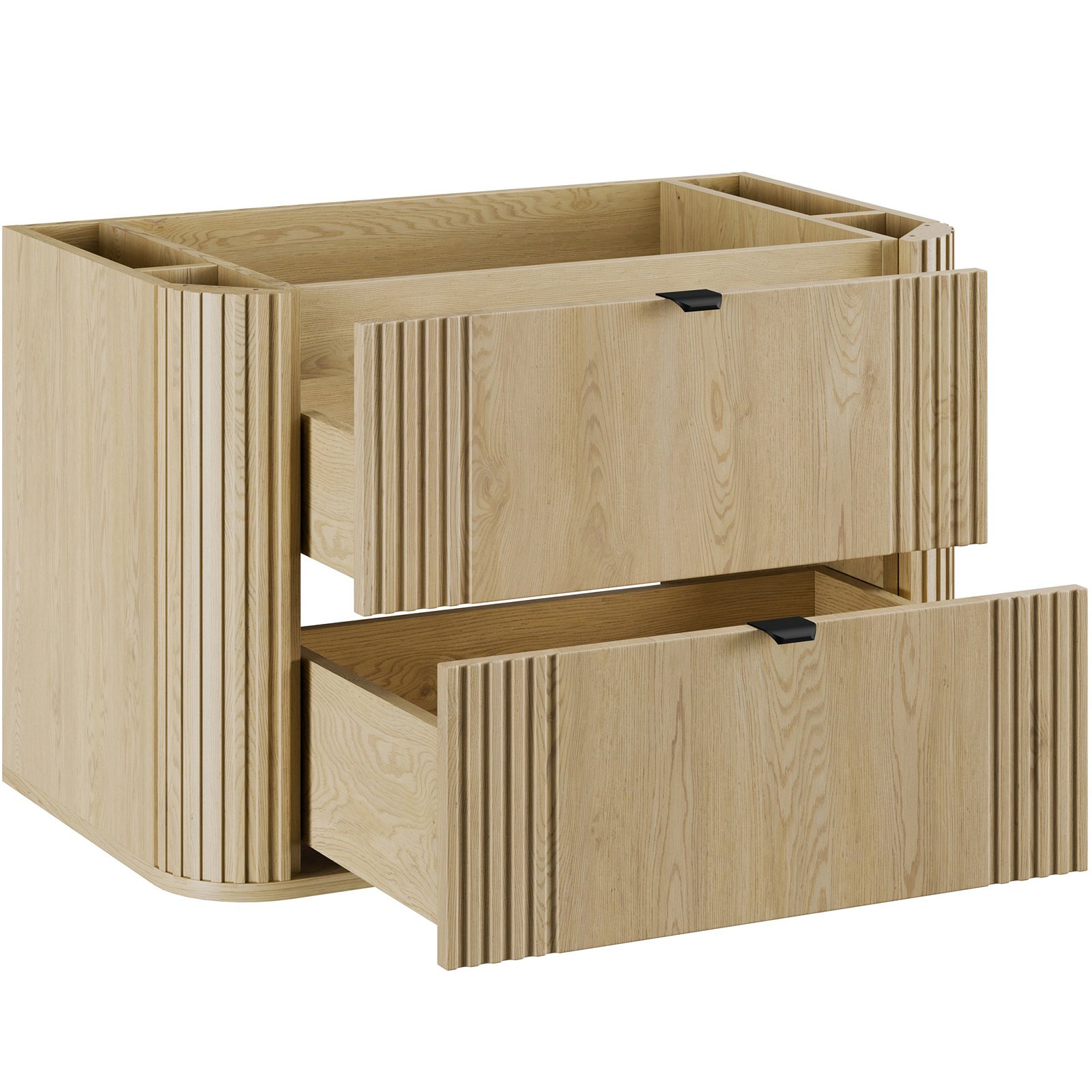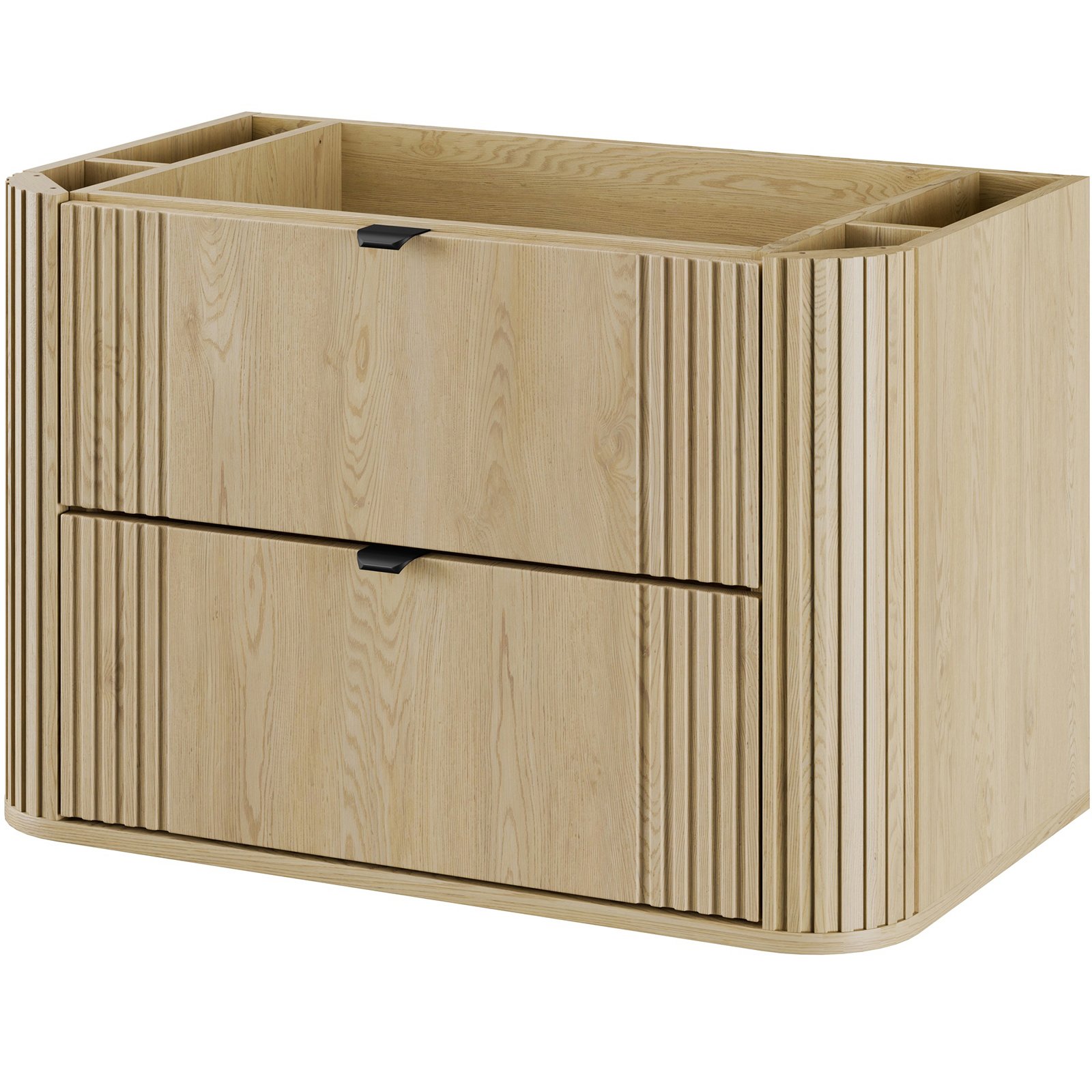 Szafka pod umywalkę 80 cm z dwiema szufladami z kolekcji Ovalia Cremona to wyrazisty akcent we wnętrzu – unikalne połączenie subtelności i charakteru, które natychmiast przyciąga wzrok. Charakterystyczne zaokrąglone rogi szafek, dodają bryłom wizualnej lekkości, a wyraziste, pionowe ryflowania – obecne zarówno po bokach frontów, jak i na zaokrągleniach – podkreślają ich wyjątkową formę. Ciepły dekor Dąb Cremona odwzorowuje naturalne piękno drewna, tworząc przytulną atmosferę, a smukłe, czarne uchwyty z metalu wprowadzają interesujący kontrast i nadają eleganckiego wykończenia.