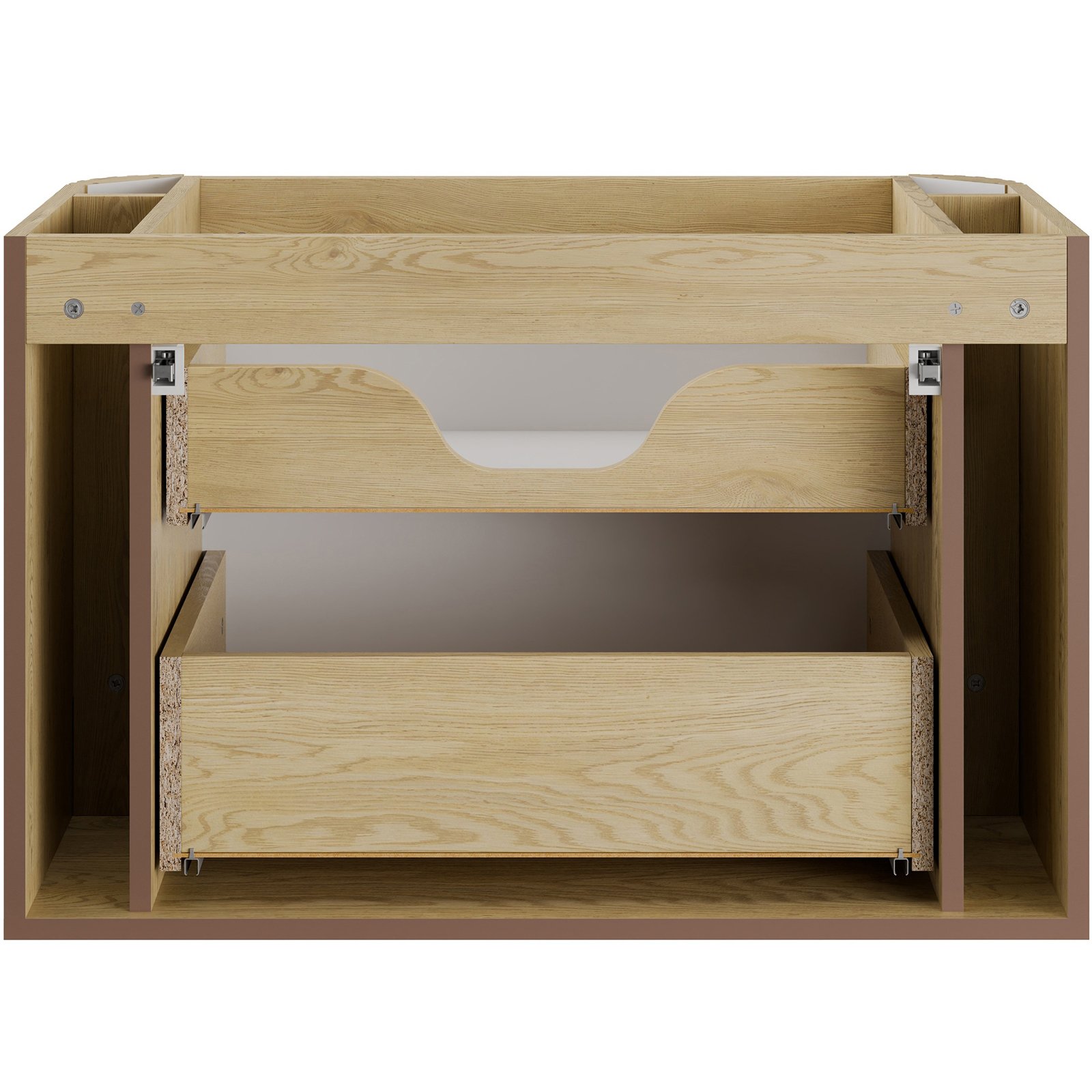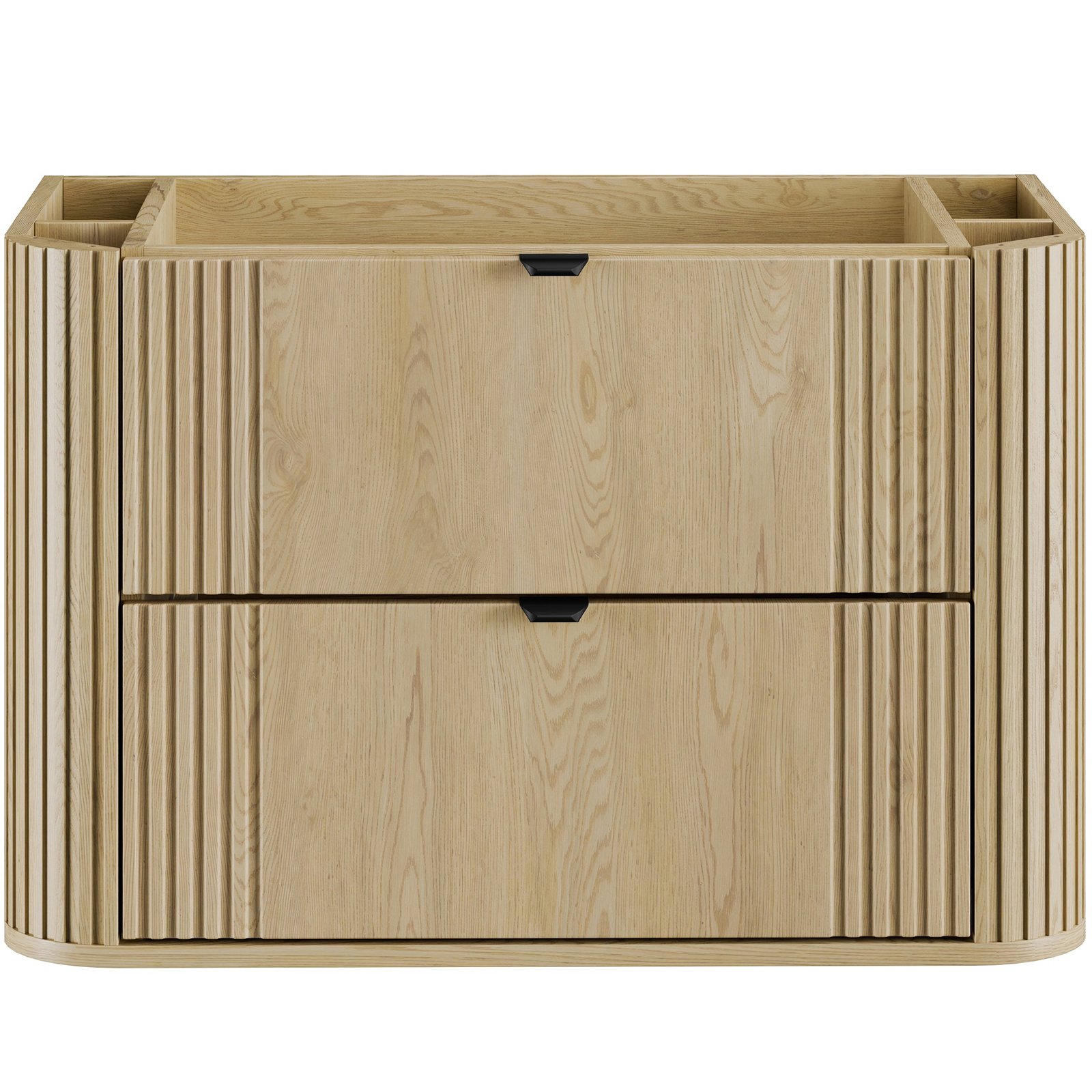 Dwie szuflady oferują dużą miejsca do przechowywania akcesoriów łazienkowych, utrzymując porządek. Meble zostały wykonane z płyty MDF i płyty laminowanej zapewniając estetyczny wygląd na lata. Komfort codziennego użytkowania podnosi system cichego domykania, który sprawia, że otwieranie i zamykanie frontów jest płynne i bezgłośne. Szafki pod umywalkę o głębokości 46 cm łączą funkcjonalność z unikalną formą, a dzięki dedykowanym, zaokrąglonym umywalkom Pure oraz dopasowanym blatom tworzą kompletne, gotowe rozwiązanie.
