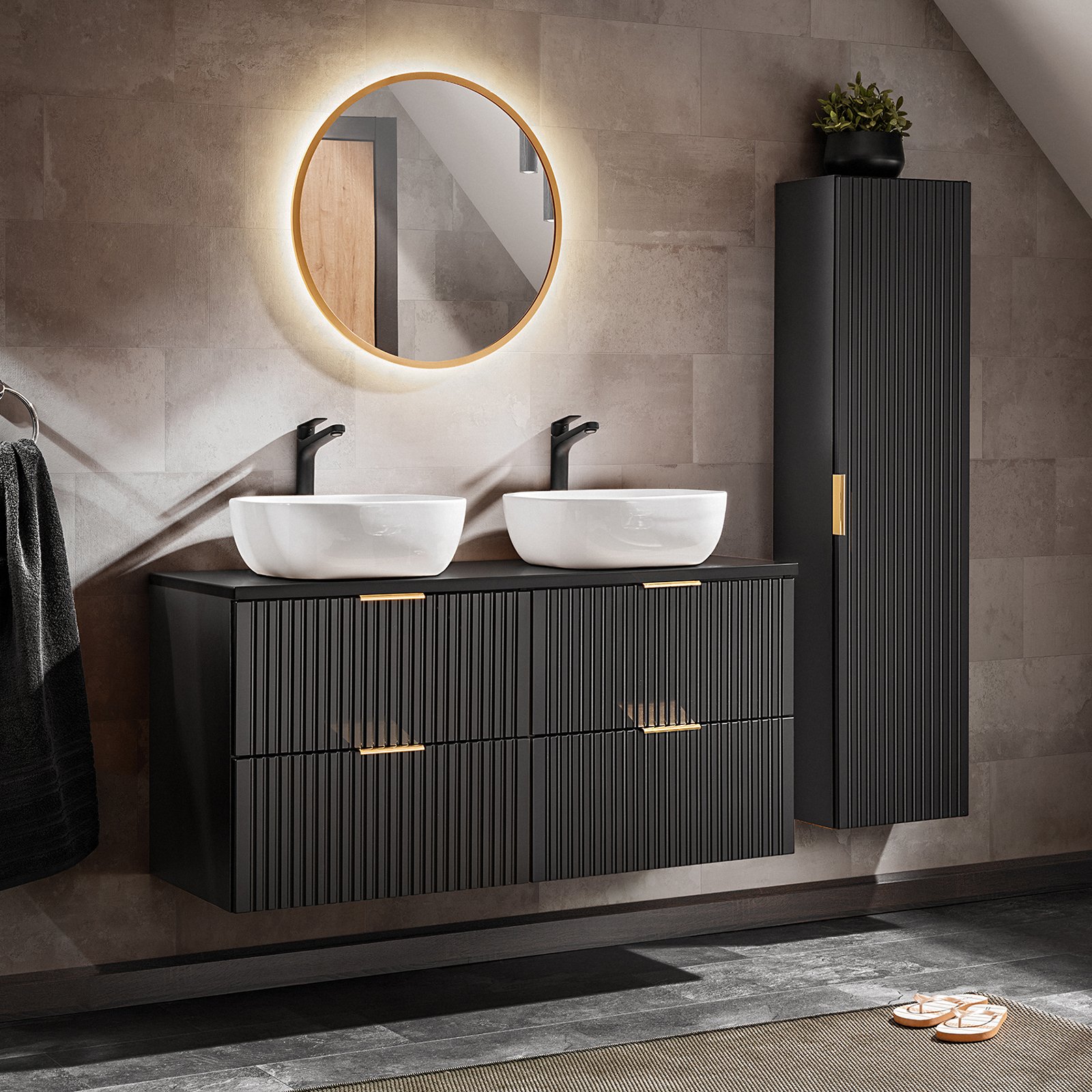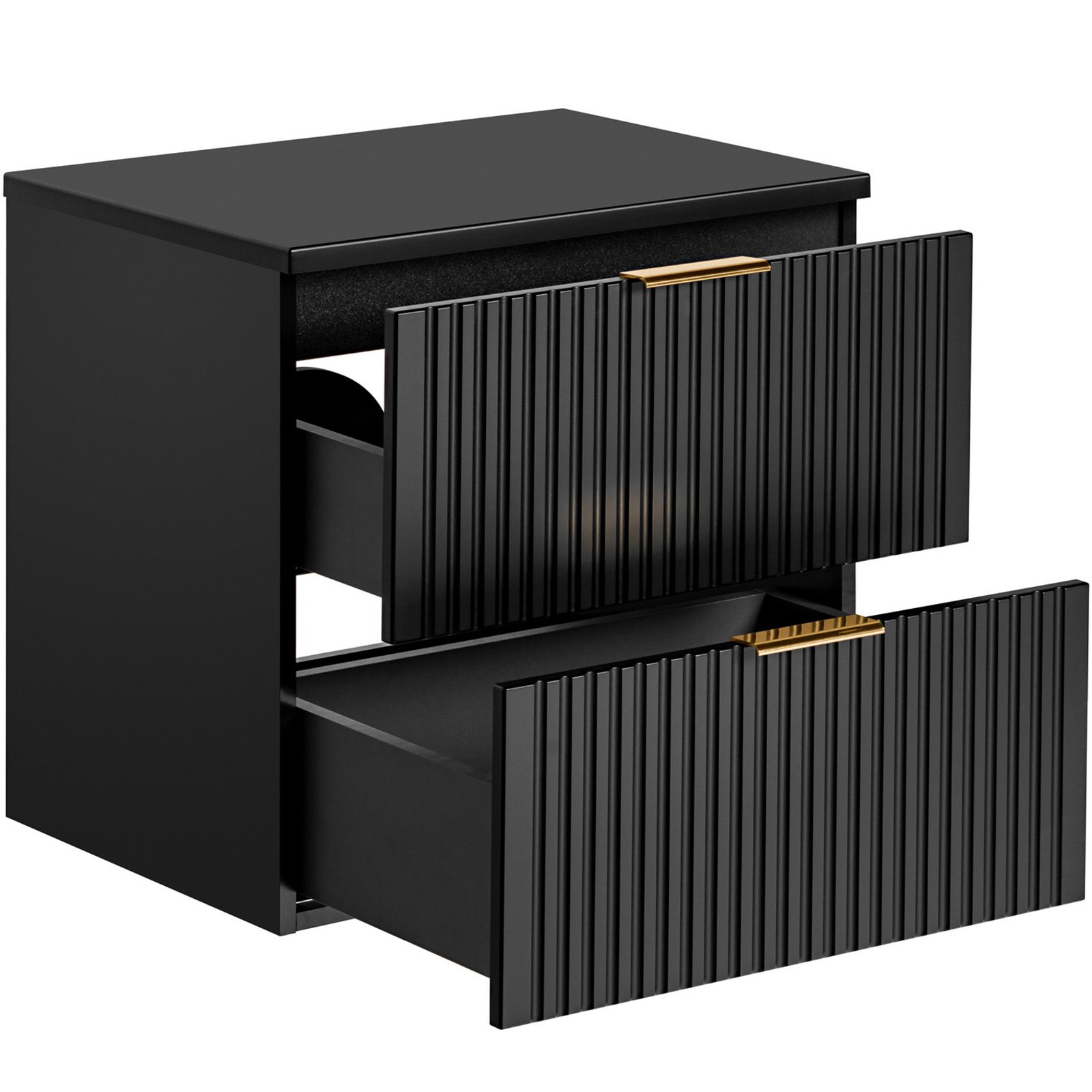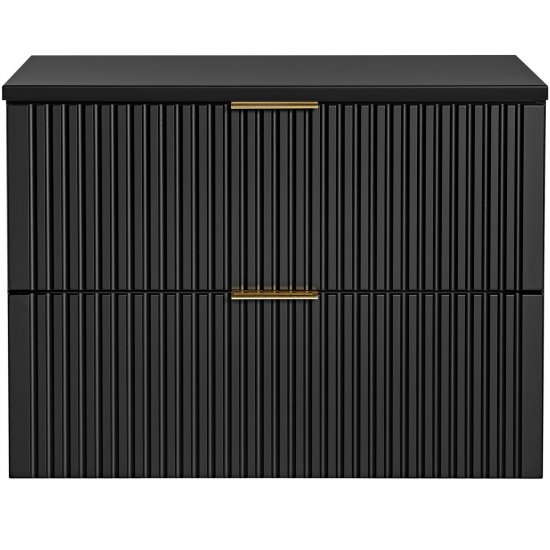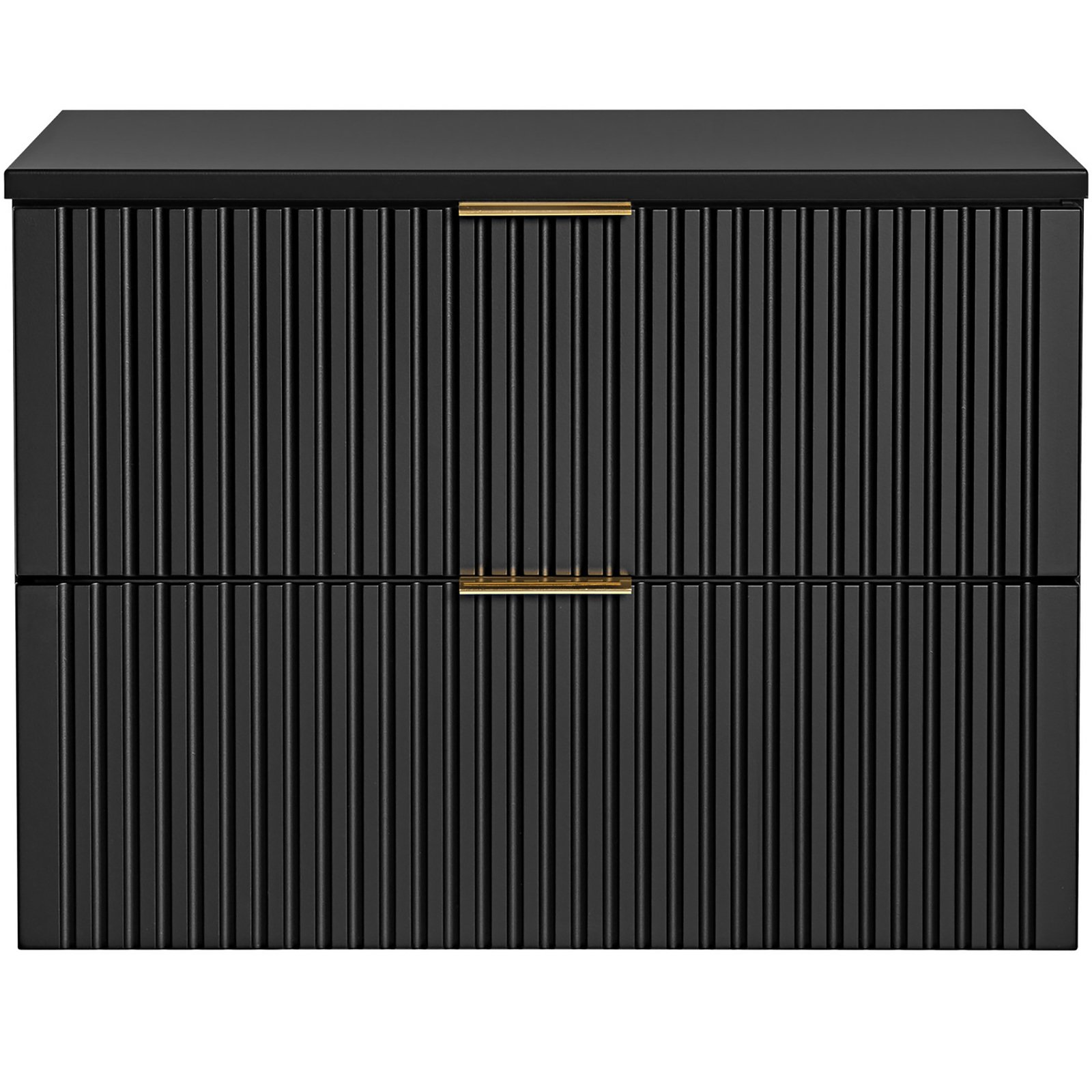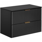 Szafka pod umywalkę 80 cm z dwoma szufladami z kolekcji Adel Black łączy elegancję z funkcjonalnością. Charakteryzuje się klasycznymi proporcjami brył i wyjątkowymi, ryflowanymi frontami. Uchwyty w trzech kolorach - złoty połysk, chrom połysk oraz czarny mat - nadają jej stylowy wygląd.