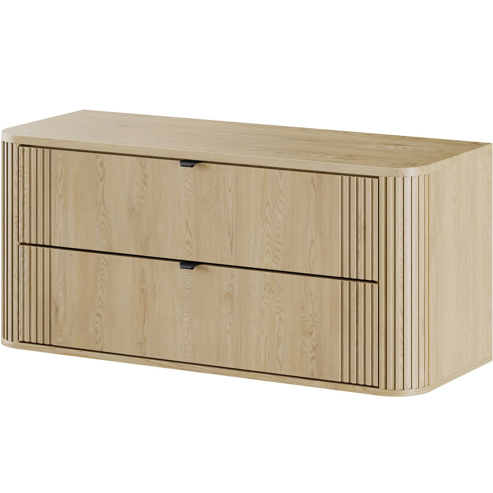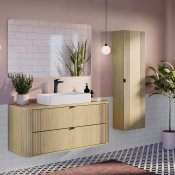 Szafka pod umywalkę 120 cm z dwiema szufladami z kolekcji Ovalia Cremona to wyrazisty akcent we wnętrzu – unikalne połączenie subtelności i charakteru, które natychmiast przyciąga wzrok. Charakterystyczne zaokrąglone rogi szafek, dodają bryłom wizualnej lekkości, a wyraziste, pionowe ryflowania – obecne zarówno po bokach frontów, jak i na zaokrągleniach – podkreślają ich wyjątkową formę. Ciepły dekor Dąb Cremona odwzorowuje naturalne piękno drewna, tworząc przytulną atmosferę, a smukłe, czarne uchwyty z metalu wprowadzają interesujący kontrast i nadają eleganckiego wykończenia.