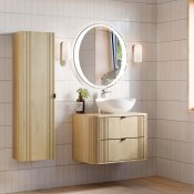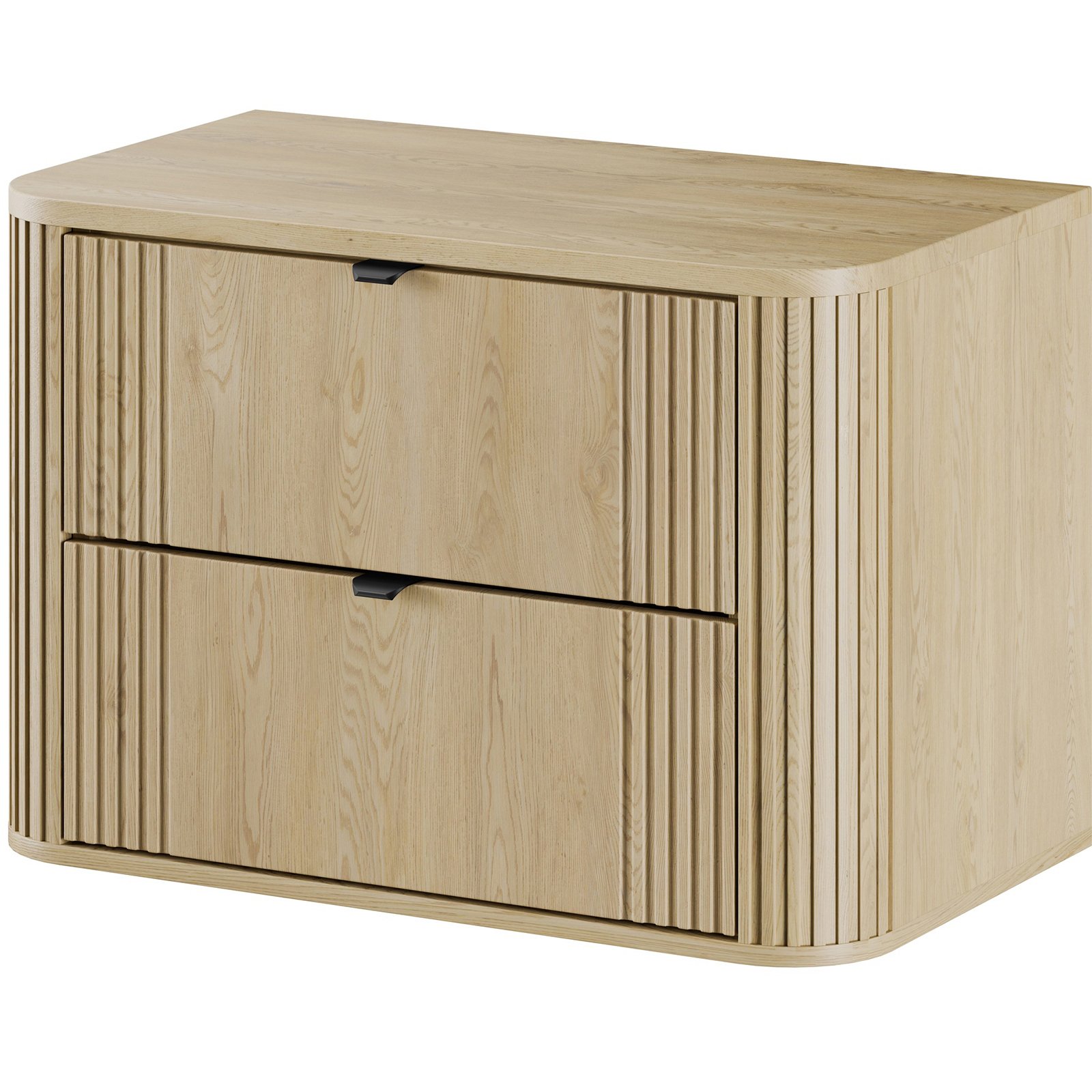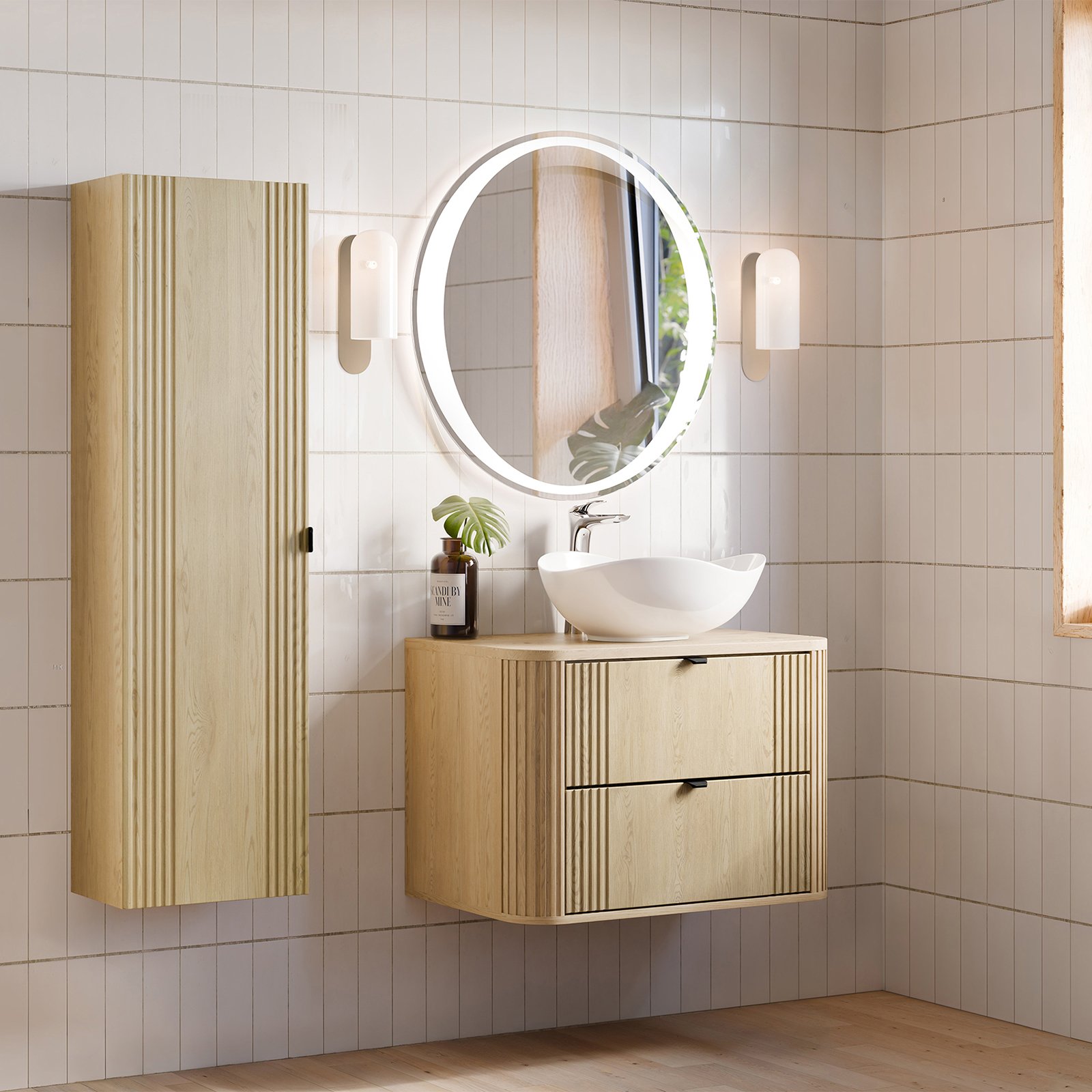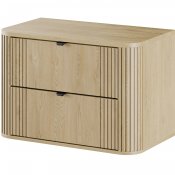 Szafka pod umywalkę 80 cm z dwiema szufladami z kolekcji Ovalia Cremona to wyrazisty akcent we wnętrzu – unikalne połączenie subtelności i charakteru, które natychmiast przyciąga wzrok. Charakterystyczne zaokrąglone rogi szafek, dodają bryłom wizualnej lekkości, a wyraziste, pionowe ryflowania – obecne zarówno po bokach frontów, jak i na zaokrągleniach – podkreślają ich wyjątkową formę. Ciepły dekor Dąb Cremona odwzorowuje naturalne piękno drewna, tworząc przytulną atmosferę, a smukłe, czarne uchwyty z metalu wprowadzają interesujący kontrast i nadają eleganckiego wykończenia.