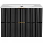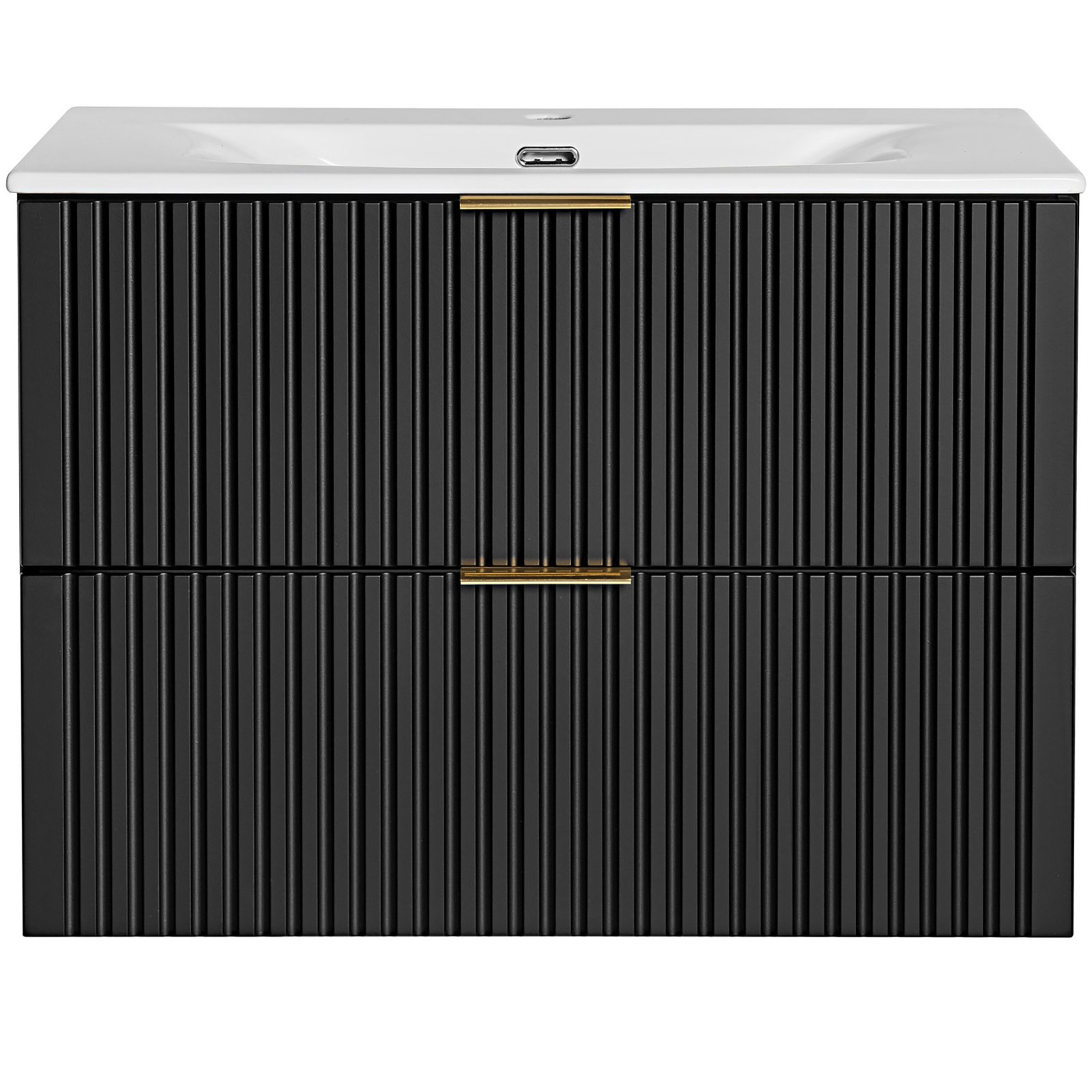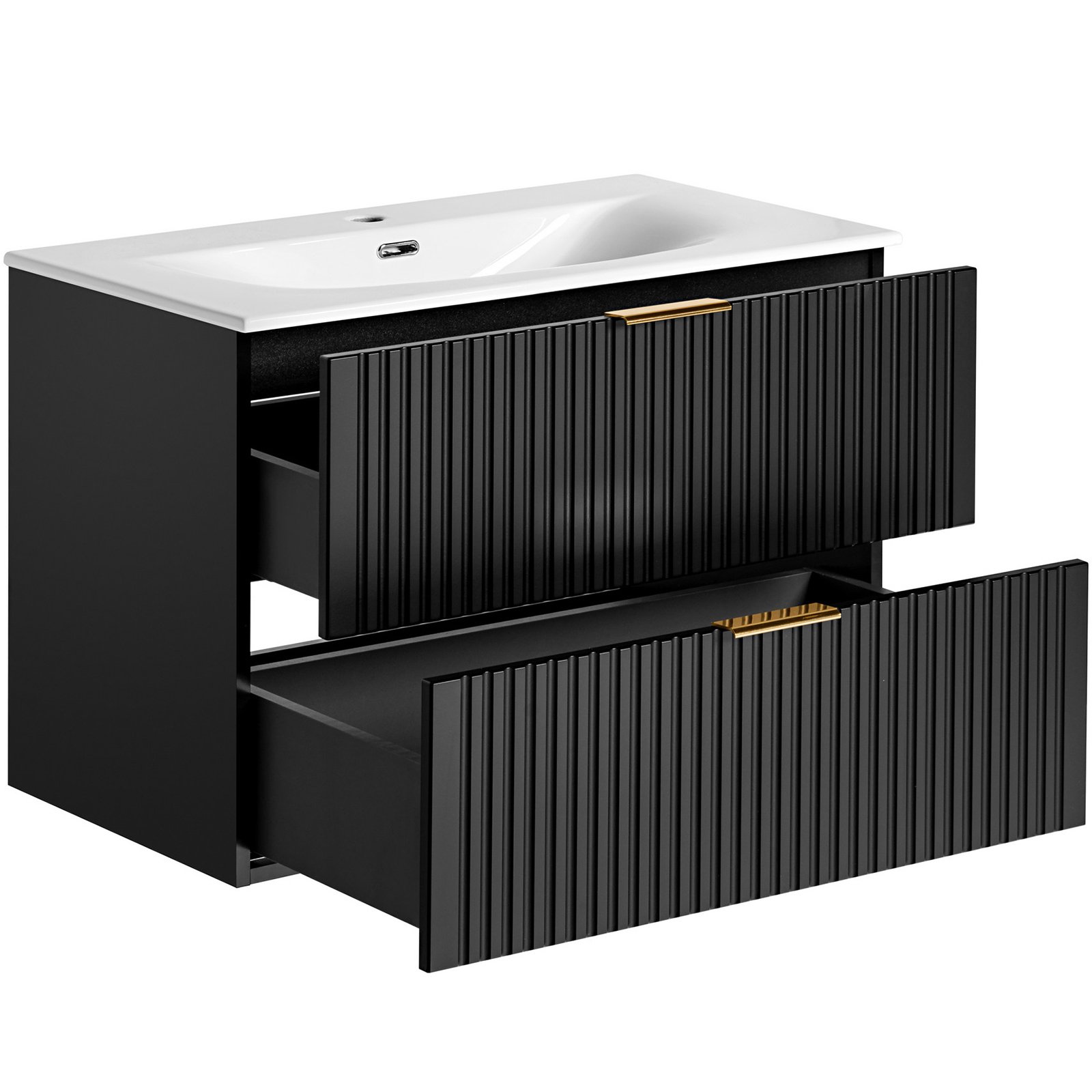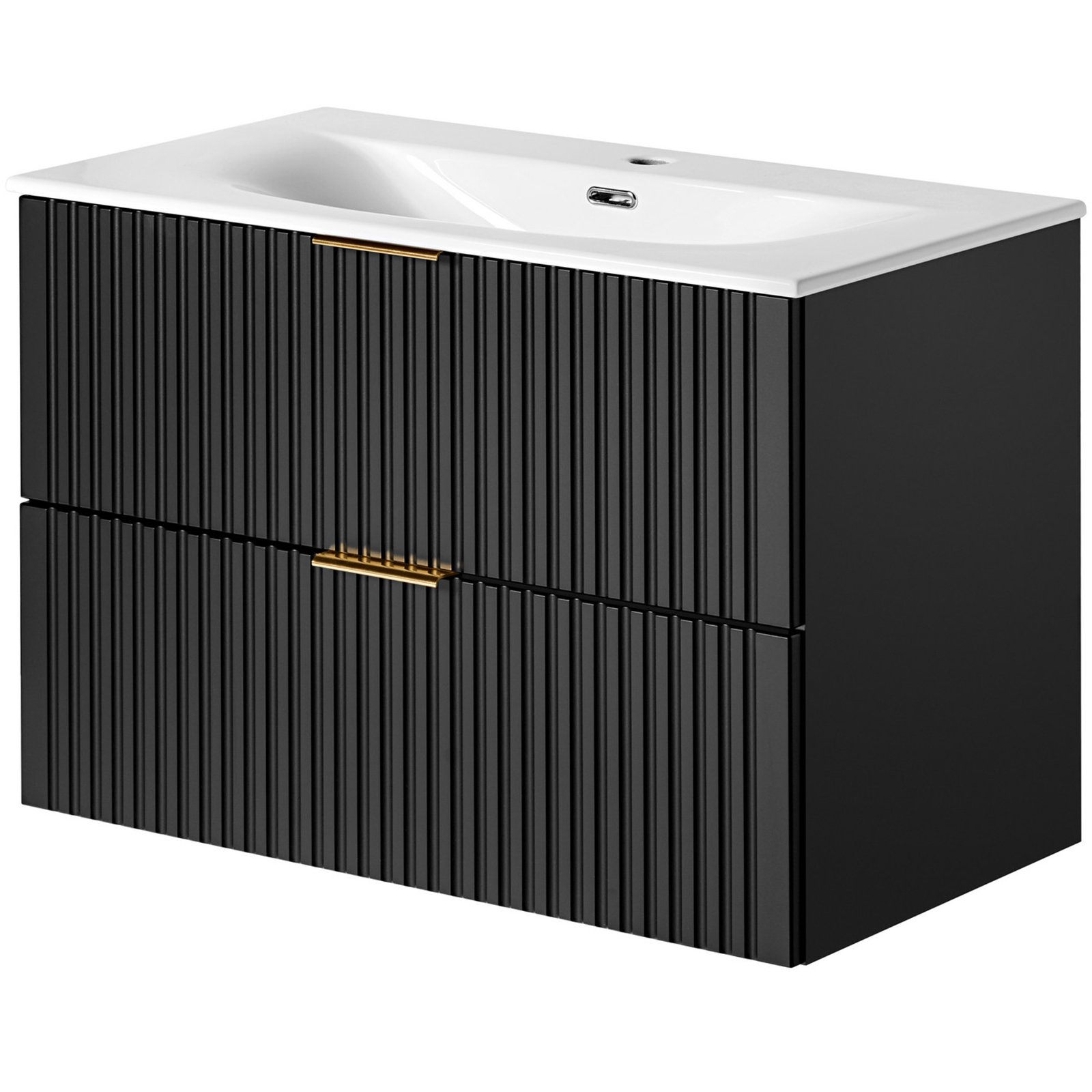 Szafka pod umywalkę 80 cm z dwoma szufladami z kolekcji Adel Black łączy elegancję z funkcjonalnością. Charakteryzuje się klasycznymi proporcjami brył i wyjątkowymi, ryflowanymi frontami. Uchwyty w trzech kolorach - złoty połysk, chrom połysk oraz czarny mat - nadają jej stylowy wygląd.