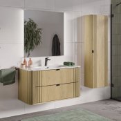 Szafka pod umywalkę 100 cm z dwiema szufladami z kolekcji Ovalia Cremona to wyrazisty akcent we wnętrzu – unikalne połączenie subtelności i charakteru, które natychmiast przyciąga wzrok. Charakterystyczne zaokrąglone rogi szafek, dodają bryłom wizualnej lekkości, a wyraziste, pionowe ryflowania – obecne zarówno po bokach frontów, jak i na zaokrągleniach – podkreślają ich wyjątkową formę. Ciepły dekor Dąb Cremona odwzorowuje naturalne piękno drewna, tworząc przytulną atmosferę, a smukłe, czarne uchwyty z metalu wprowadzają interesujący kontrast i nadają eleganckiego wykończenia.