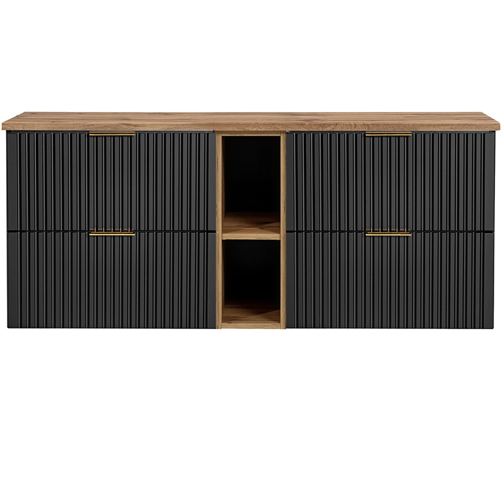 Meble wykonane z płyty MDF i płyty laminowanej zapewniają trwałość i odporność na wilgoć, co czyni je idealnym wyborem do łazienek. Pionowe, ryflowane fronty nadają meblom unikalny charakter i optycznie powiększają przestrzeń łazienki, a czarny matowy kolor nadaje wnętrzu kontrastowego designu i nowoczesnego charakteru, doskonale komponując się z różnorodnymi aranżacjami wnętrz. Niezależnie od tego, czy wnętrze jest nowoczesne, czy klasyczne, meble z tej kolekcji staną się idealnym dopełnieniem aranżacji, wnosząc elegancję i praktyczność.