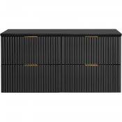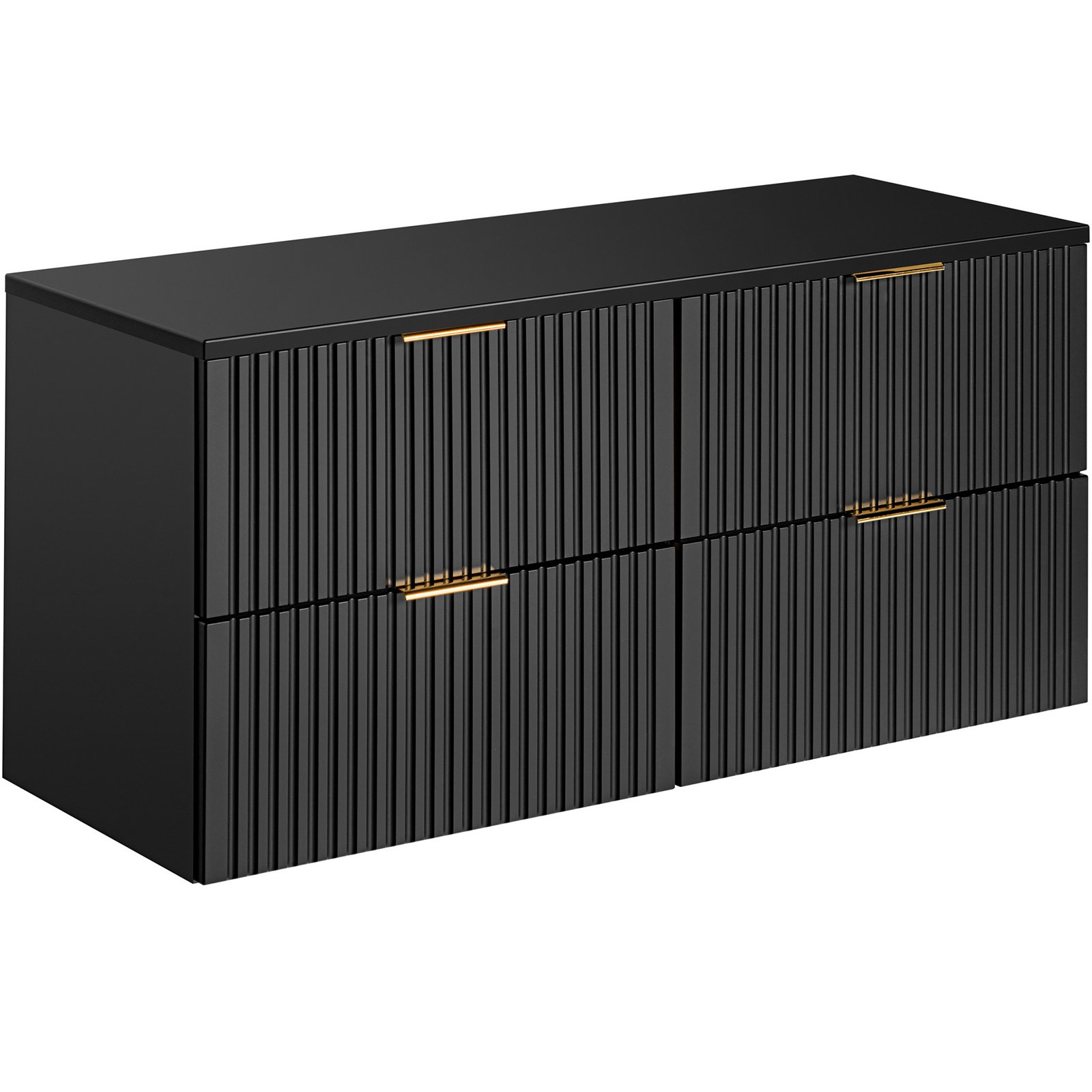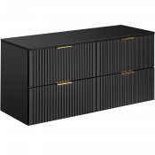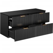 Meble wykonane z płyty MDF i płyty laminowanej zapewniają trwałość i odporność na wilgoć, co czyni je idealnym wyborem do łazienek. Pionowe, ryflowane fronty nadają meblom unikalny charakter i optycznie powiększają przestrzeń łazienki, a czarny matowy kolor nadaje wnętrzu kontrastowego designu i nowoczesnego charakteru, doskonale komponując się z różnorodnymi aranżacjami wnętrz. Niezależnie od tego, czy wnętrze jest nowoczesne, czy klasyczne, meble z tej kolekcji staną się idealnym dopełnieniem aranżacji, wnosząc elegancję i praktyczność.