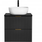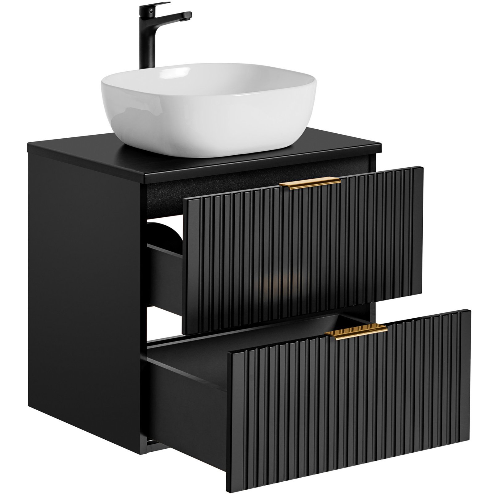 Szafka pod umywalkę 60 cm z dwoma szufladami z kolekcji Adel Black łączy elegancję z funkcjonalnością. Charakteryzuje się klasycznymi proporcjami brył i wyjątkowymi, ryflowanymi frontami. Uchwyty w trzech kolorach - złoty połysk, chrom połysk oraz czarny mat - nadają jej stylowy wygląd.