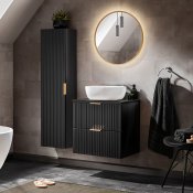 Meble wykonane z płyty MDF i płyty laminowanej zapewniają trwałość i odporność na wilgoć, co czyni je idealnym wyborem do łazienek. Pionowe, ryflowane fronty nadają meblom unikalny charakter i optycznie powiększają przestrzeń łazienki, a czarny matowy kolor nadaje wnętrzu kontrastowego designu i nowoczesnego charakteru, doskonale komponując się z różnorodnymi aranżacjami wnętrz. Niezależnie od tego, czy wnętrze jest nowoczesne, czy klasyczne, meble z tej kolekcji staną się idealnym dopełnieniem aranżacji, wnosząc elegancję i praktyczność.