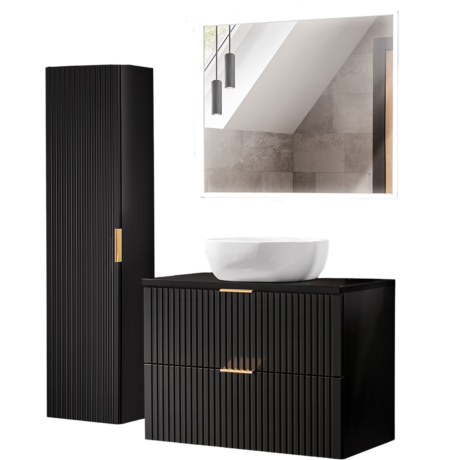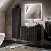 Meble wykonane z płyty MDF i płyty laminowanej zapewniają trwałość i odporność na wilgoć, co czyni je idealnym wyborem do łazienek. Pionowe, ryflowane fronty nadają meblom unikalny charakter i optycznie powiększają przestrzeń łazienki, a czarny matowy kolor nadaje wnętrzu kontrastowego designu i nowoczesnego charakteru, doskonale komponując się z różnorodnymi aranżacjami wnętrz. Niezależnie od tego, czy wnętrze jest nowoczesne, czy klasyczne, meble z tej kolekcji staną się idealnym dopełnieniem aranżacji, wnosząc elegancję i praktyczność.
