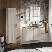 Frezowane ryfle pionowe na frontach nadają mu unikalny charakter, a dostępność uchwytów w modnych wykończeniach, takich jak złoty połysk, czarny mat czy chrom połysk, pozwala na personalizację według własnych preferencji. W skład zestawu wchodzi praktyczna szafka pod umywalkę, elegancki blat oraz szafka z koszem na pranie, co sprawia, że Twój codzienny rytuał w łazience stanie się jeszcze bardziej komfortowy.