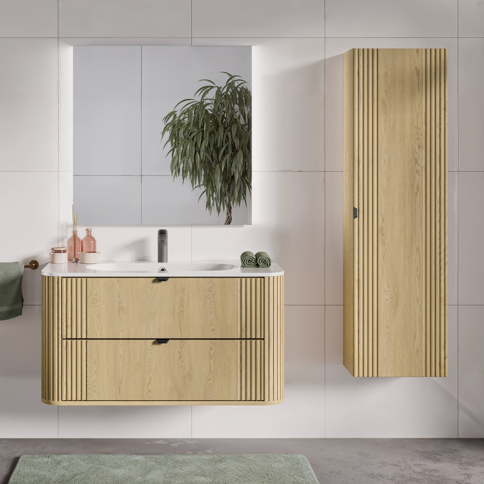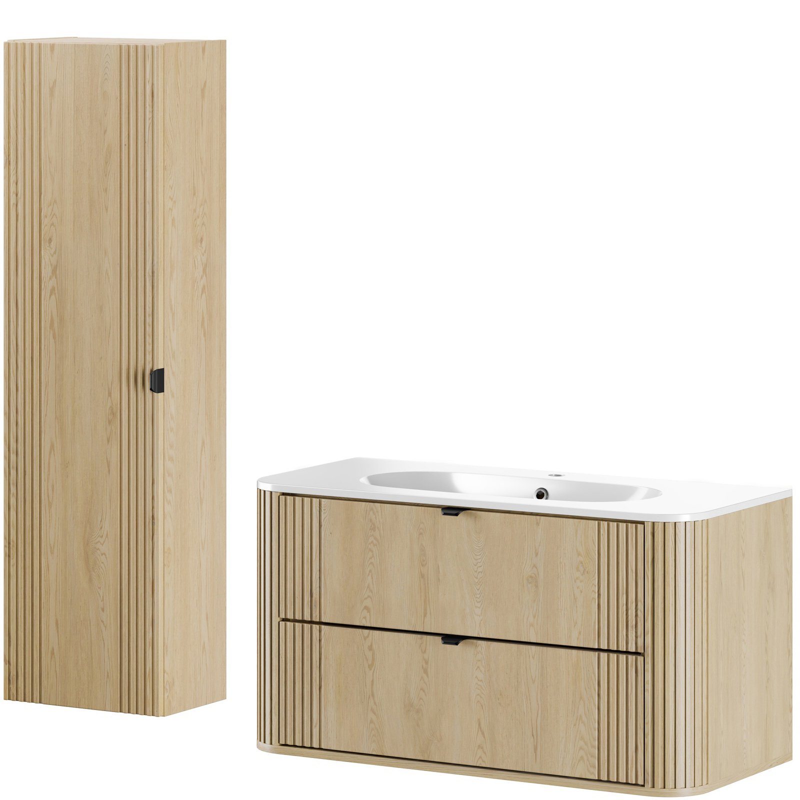 Szafka pod umywalkę 100 cm z dwiema szufladami z kolekcji Ovalia Cremona to wyrazisty akcent we wnętrzu – unikalne połączenie subtelności i charakteru, które natychmiast przyciąga wzrok. Charakterystyczne zaokrąglone rogi szafek, dodają bryłom wizualnej lekkości, a wyraziste, pionowe ryflowania – obecne zarówno po bokach frontów, jak i na zaokrągleniach – podkreślają ich wyjątkową formę. Ciepły dekor Dąb Cremona odwzorowuje naturalne piękno drewna, tworząc przytulną atmosferę, a smukłe, czarne uchwyty z metalu wprowadzają interesujący kontrast i nadają eleganckiego wykończenia.