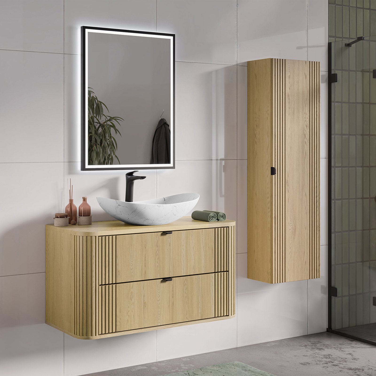 Szafka pod umywalkę 100 cm z dwiema szufladami z kolekcji Ovalia Cremona to wyrazisty akcent we wnętrzu – unikalne połączenie subtelności i charakteru, które natychmiast przyciąga wzrok. Charakterystyczne zaokrąglone rogi szafek, dodają bryłom wizualnej lekkości, a wyraziste, pionowe ryflowania – obecne zarówno po bokach frontów, jak i na zaokrągleniach – podkreślają ich wyjątkową formę. Ciepły dekor Dąb Cremona odwzorowuje naturalne piękno drewna, tworząc przytulną atmosferę, a smukłe, czarne uchwyty z metalu wprowadzają interesujący kontrast i nadają eleganckiego wykończenia.