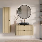 Szafka pod umywalkę 100 cm z dwiema szufladami z kolekcji Ovalia Cremona to wyrazisty akcent we wnętrzu – unikalne połączenie subtelności i charakteru, które natychmiast przyciąga wzrok. Charakterystyczne zaokrąglone rogi szafek, dodają bryłom wizualnej lekkości, a wyraziste, pionowe ryflowania – obecne zarówno po bokach frontów, jak i na zaokrągleniach – podkreślają ich wyjątkową formę. Ciepły dekor Dąb Cremona odwzorowuje naturalne piękno drewna, tworząc przytulną atmosferę, a smukłe, czarne uchwyty z metalu wprowadzają interesujący kontrast i nadają eleganckiego wykończenia.