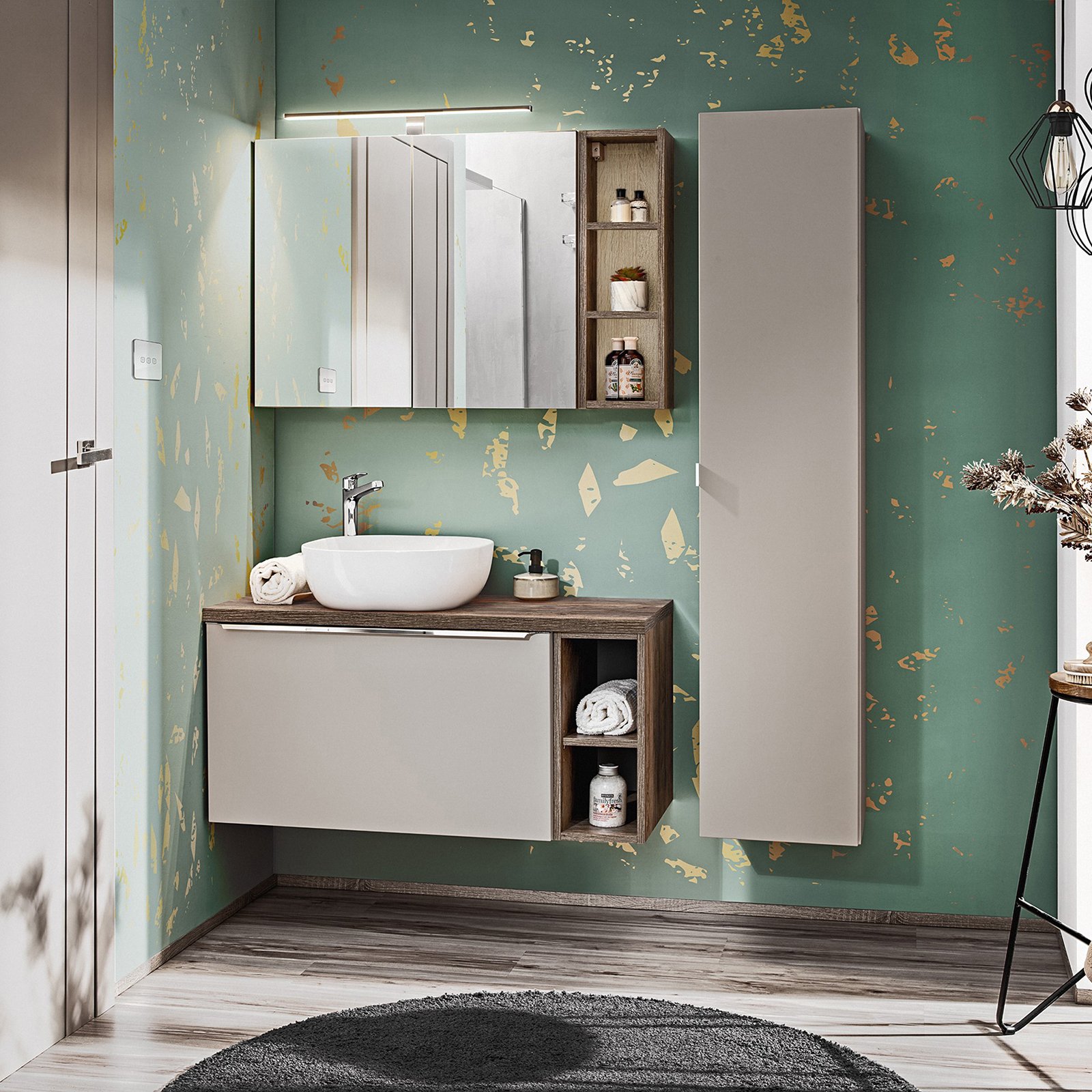 Zestaw mebli SANTA FE TAUPE 3 szafki, blat OAK 80 cm, umywalka SMILE, słupek, lampka