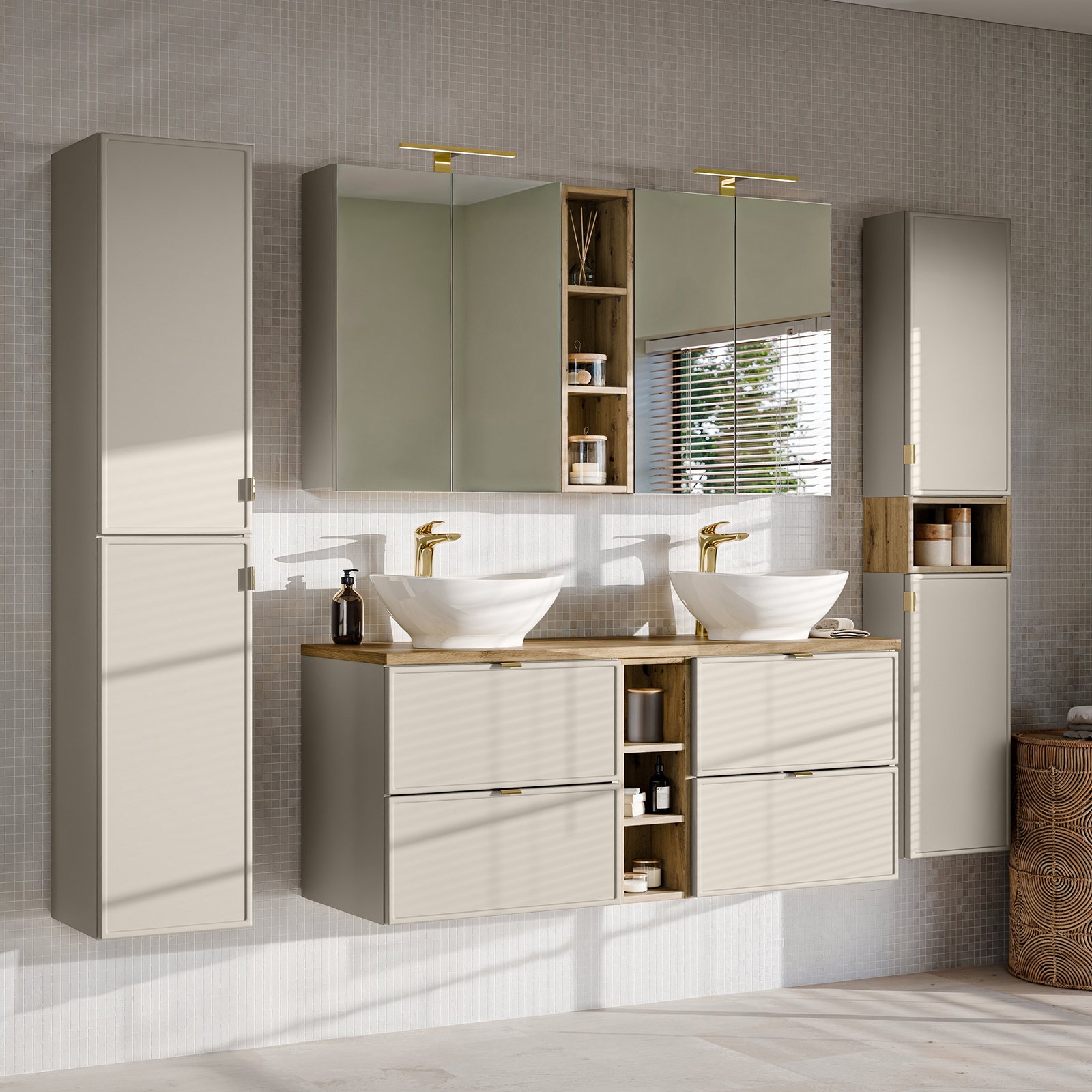 Szafka stojąca o szerokości 35 cm z kolekcji Bella Cashmere doskonale wpisuje się w nowoczesne i klasyczne aranżacje łazienkowe. Mebel został starannie wykończony w subtelnym odcieniu kaszmiru, nadając wnętrzu łagodny, harmonijny charakter. Charakterystyczne fronty z frezowaną ramką dodają mu wyrafinowanego stylu. Uchwyty w trzech kolorach - złoty połysk, chrom połysk oraz czarny mat - nadają stylowy wygląd.