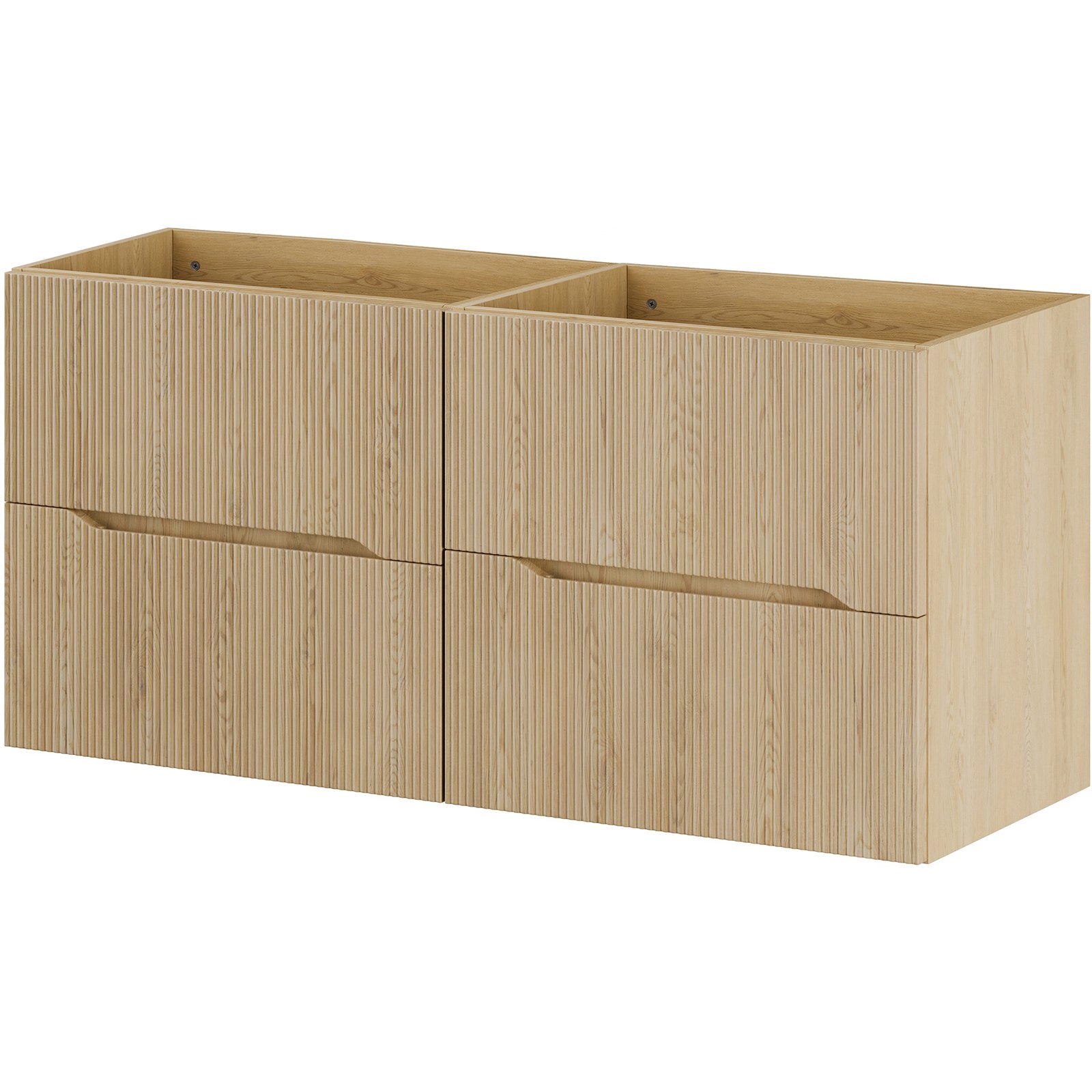 Szafka pod umywalkę 2x60 cm z czterema szufladami z kolekcji Nordic Cremona to wyważone połączenie nowoczesnej formy i subtelnej elegancji. Fronty zdobione delikatnymi, pionowymi ryflowaniami nadają meblom lekkości i wyrafinowanego charakteru. Dekor Dąb Cremona ociepla wnętrze odwzorowując naturalne piękno drewna. Asymetryczny podchwyt, wkomponowany w bryłę mebla, nadaje całości nowoczesnego i spójnego wyglądu.