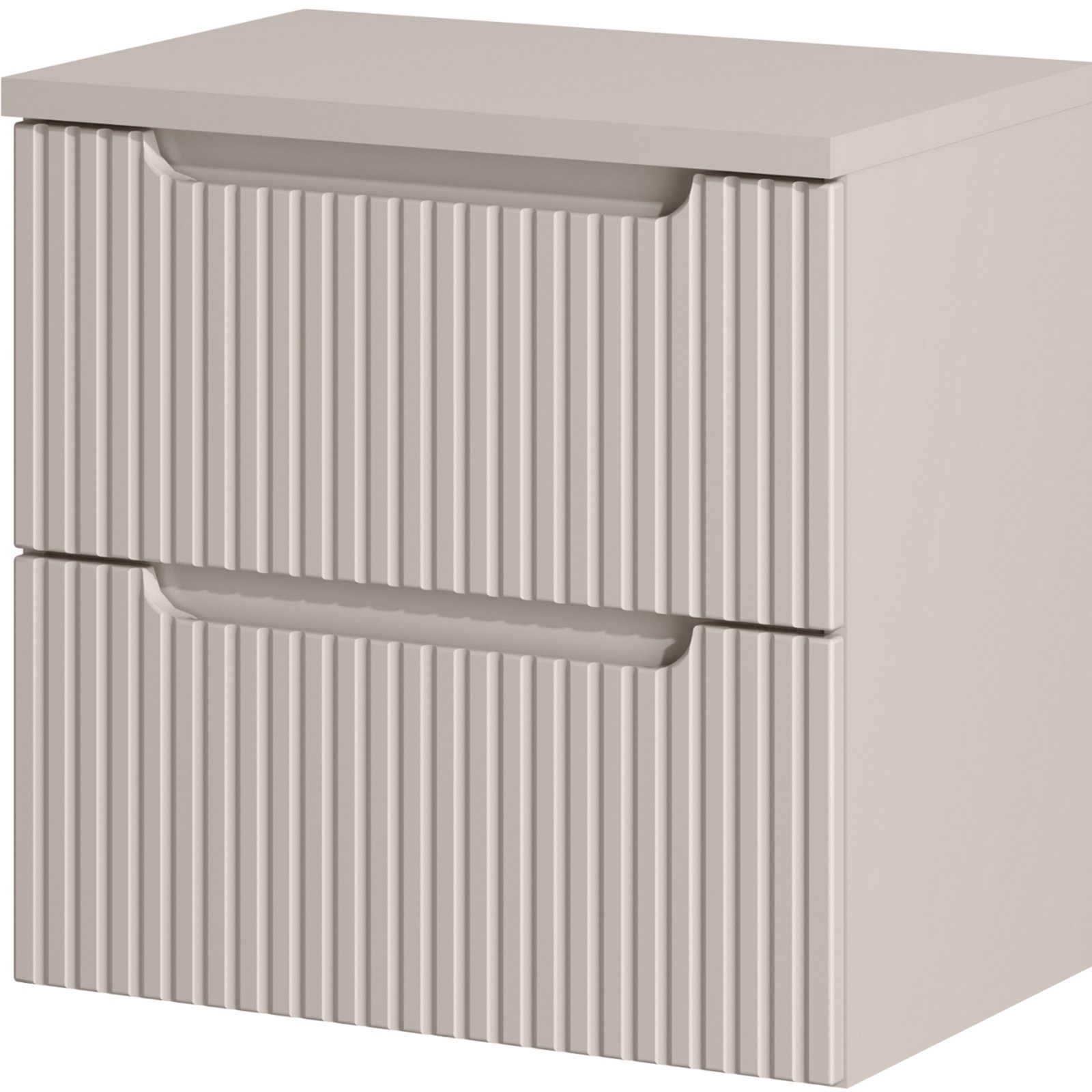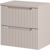 Kolor kaszmirowy mat oraz frezowane ryfle pionowe na frontach nadają zestawowi eleganckiego wyglądu. Dzięki solidnej konstrukcji i wysokiej jakości materiałom, meble są odporne na uszkodzenia i łatwe w utrzymaniu czystości. Zestaw meblowy 60 cm z blatem z kolekcji Nova Cashmere to doskonały wybór dla osób ceniących sobie funkcjonalność, komfort i styl w łazience. Dwie pojemne szuflady oferują dużą miejsca do przechowywania akcesoriów łazienkowych, utrzymując porządek, a dzięki systemowi cichego domykania szuflad zapewnia dodatkowy komfort użytkowani.