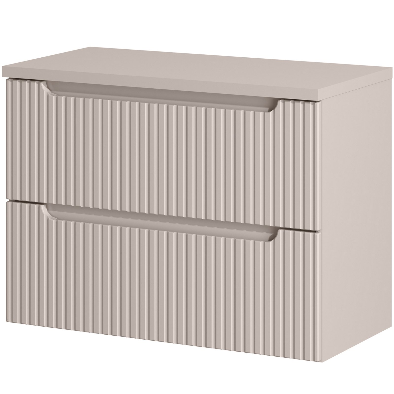 Kolor kaszmirowy mat oraz frezowane ryfle pionowe na frontach nadają zestawowi eleganckiego wyglądu. Dzięki solidnej konstrukcji i wysokiej jakości materiałom, meble są odporne na uszkodzenia i łatwe w utrzymaniu czystości. Zestaw meblowy 80 cm z blatem z kolekcji Nova Cashmere to doskonały wybór dla osób ceniących sobie funkcjonalność, komfort i styl w łazience. Dwie pojemne szuflady oferują dużą miejsca do przechowywania akcesoriów łazienkowych, utrzymując porządek, a dzięki systemowi cichego domykania szuflad zapewnia dodatkowy komfort użytkowani.
