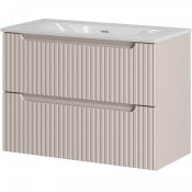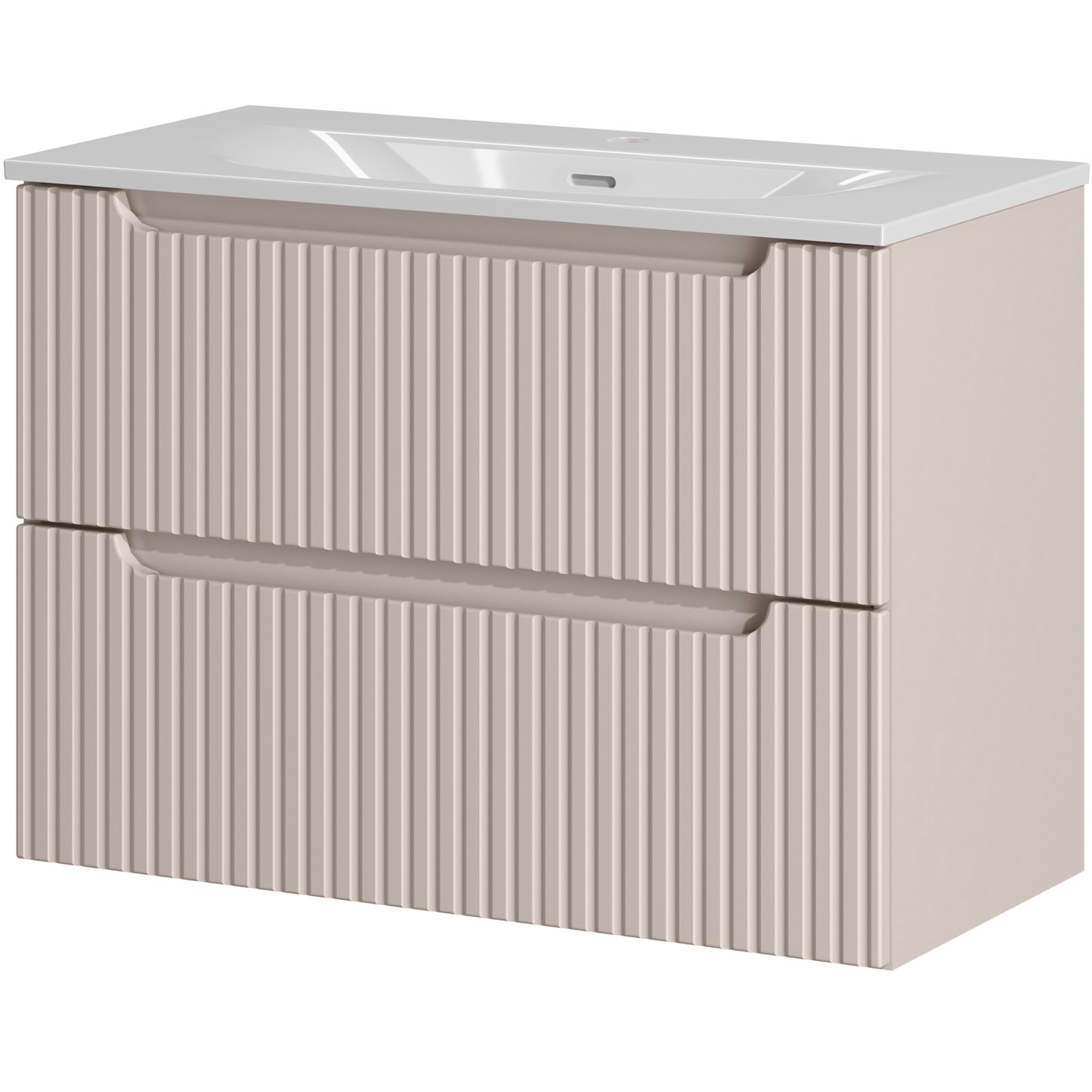 Szafka umywalkowa z dwiema szufladami o wymiarach 80x40 cm z kolekcji Nova Cashmere wykonana jest w kolorze kaszmirowy mat z frontami frezowanymi i ryflami pionowymi. Zintegrowane podchwyty nie tylko podkreślają styl, ale również wprowadzają spójność wizualną.