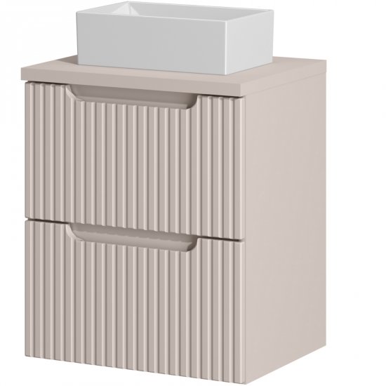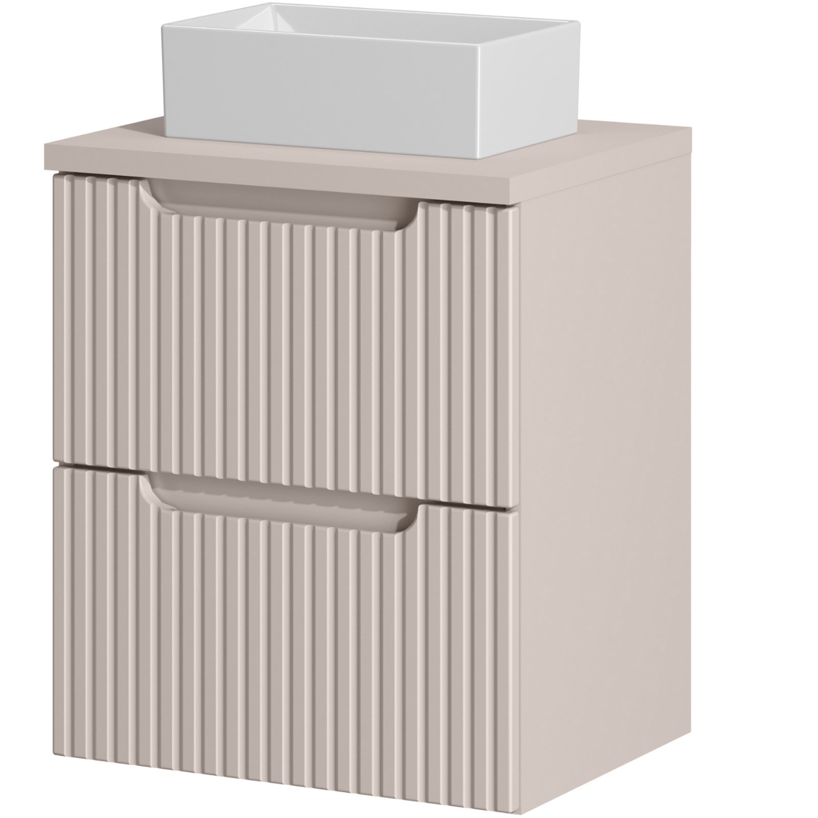 Kolor kaszmirowy mat oraz frezowane ryfle pionowe na frontach nadają zestawowi eleganckiego wyglądu. Dzięki solidnej konstrukcji i wysokiej jakości materiałom, meble są odporne na uszkodzenia i łatwe w utrzymaniu czystości. Zestaw meblowy 50 cm z blatem z kolekcji Nova Cashmere to doskonały wybór dla osób ceniących sobie funkcjonalność, komfort i styl w łazience. Zintegrowane podchwyty nie tylko podkreślają jej styl, ale również wprowadzają spójność wizualną. Dwie pojemne szuflady oferują dużą miejsca do przechowywania akcesoriów łazienkowych, utrzymując porządek, a dzięki systemowi cichego domykania szuflad zapewnia dodatkowy komfort użytkowani.