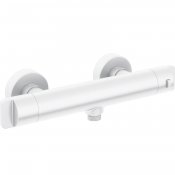 Bateria natryskowa z termostatem pozwala na utrzymanie stałej, przyjemnej dla ciała temperatury pod prysznicem. Wykonana została z wysokojakościowego mosiądzu i wyposażona w zawory zwrotne. Bateria ma możliwość blokady temperatury 38 stopni, co jest szczególnie przydatne, gdy z natrysku korzystają małe dzieci lub starsze osoby. Ponadto bateria posiada wyjątkowo ergonomiczne pokrętła, które ułatwiają regulację wypływu wody, a przy tym stanowią efektowny element dekoracyjny. Białe, matowe wykończenie doskonale wpasuje się w nowoczesne czy też skandynawskie aranżacje.