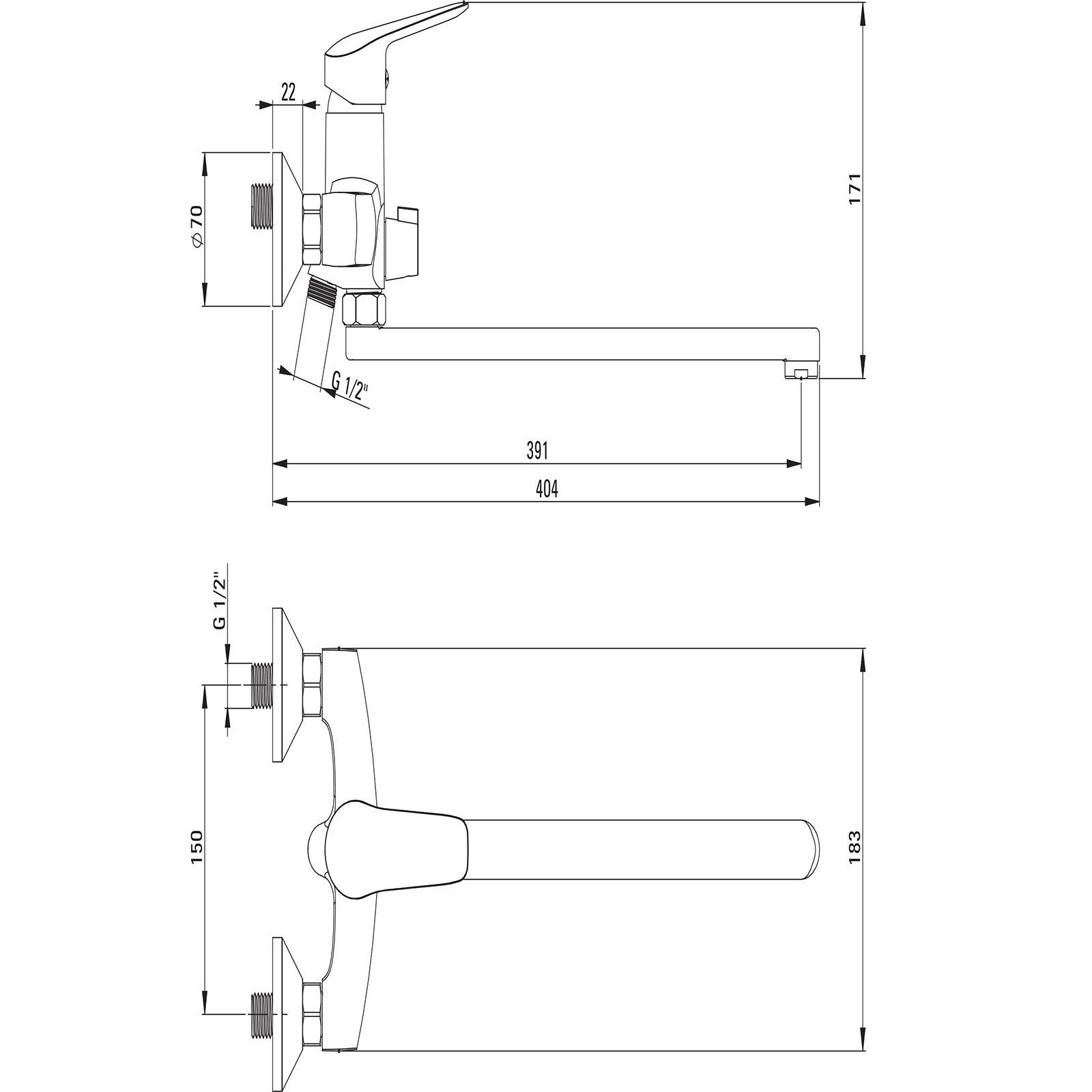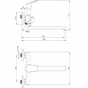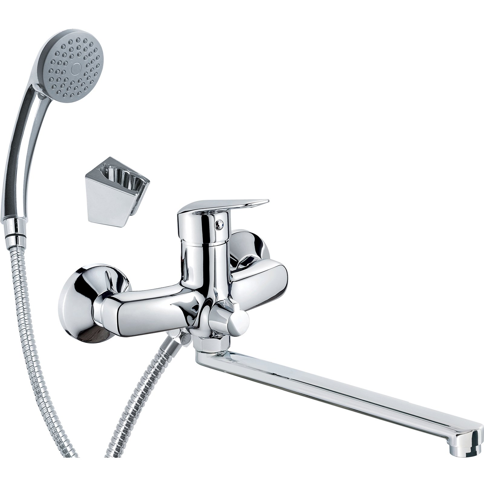 Bateria wannowa ścienna z wydłużona wylewką i zestawem natryskowym
