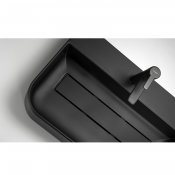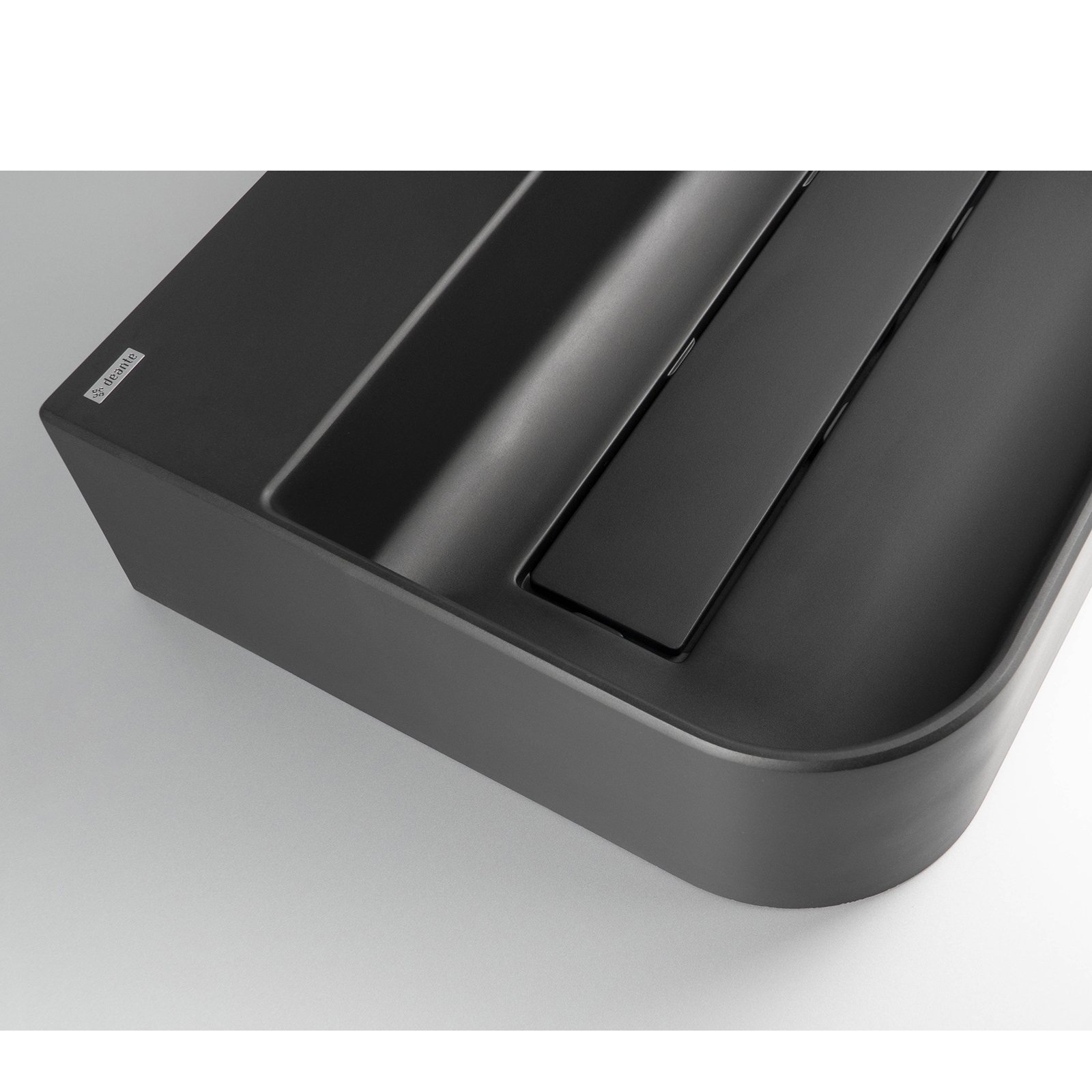 Umywalka granitowa z maskownicą przelewu w kolorze nero charakteryzuje się nowoczesnym i eleganckim designem. Posiada zaoblone brzegi z przodu, co nadaje jej miękki, estetyczny wygląd i zwiększa komfort użytkowania. Wykonana z granitu Deante, jest odporna na uderzenia, wysoką temperaturę, przebarwienia oraz szok termiczny. Dzięki właściwościom hydrofobowym odpycha cząsteczki wody, co ułatwia utrzymanie czystości. Powierzchnia umywalki wzbogacona jest jonami srebra, które zapewniają działanie antyseptyczne. Maskownica przelewu, precyzyjnie wykonana z granitu w odcieniu nero podkreśla elegancję i spójność całej formy. Głęboka, czarna barwa nero oraz zaoblony kształt doskonale pasuje do czarnej armatury o obłych kształtach.