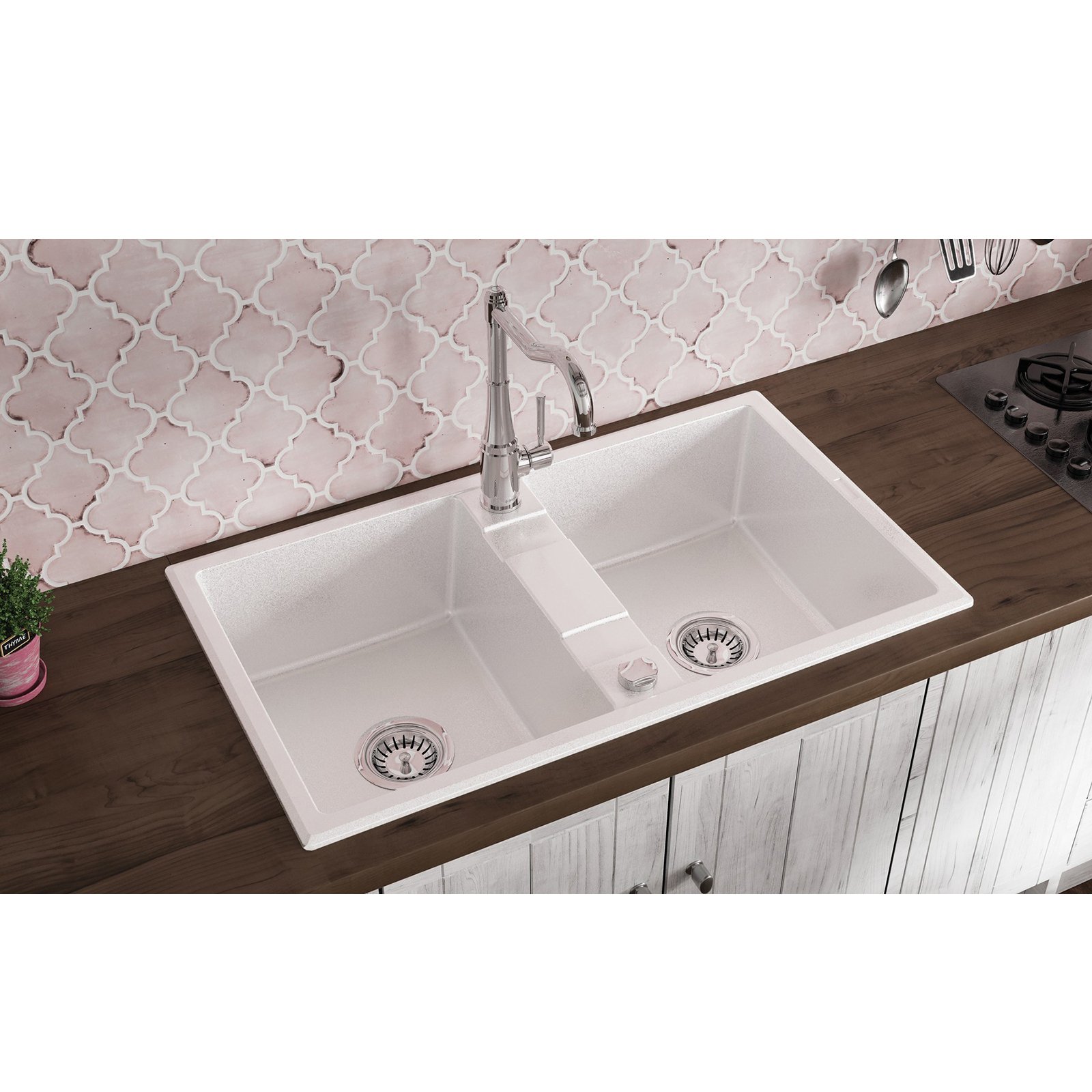 Zlewozmywak 2-komorowy Eridan z dwiema przestronnymi komorami, zachwyca swoją funkcjonalnością, wytrzymałością i designem i doskonale sprawdzi się w dużych kuchniach, których użytkownicy lubią gotować. Zaprojektowany z myślą o maksymalnym wykorzystaniu przestrzeni, pomieści więcej niż standardowe zlewy o tych samych gabarytach zewnętrznych. Jasny, alabastrowy odcień świetnie sprawdzi się w kuchniach o stylistyce minimalistycznej, jak i w tych klasycznych, kontrastując z ciemnymi blatami lub współgrając z jasnym kamieniem, kompozytem lub drewnem.