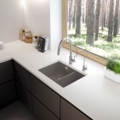 Zlewozmywak Eridan 1,5-komorowy w antracytowym odcieniu, jest produktem bardzo wysokiej jakości, który sprawdzi się w kuchniach urządzonych zarówno w skandynawskiej, jak i minimalistycznej i ultranowoczesnej stylistyce. Granitowa powierzchnia jest nie tylko trwała, odporna na ścieranie, przebarwienia, wysoką temperaturę (do 250°C) i uderzenia, ale także odpycha cząsteczki płynów, dzięki czemu napoje takie jak soki, kawa czy herbata szybko spływają i nie pozostawiają śladów. Granitowa powierzchnia nie przyjmuje także żadnych zapachów, jest odporna na szok termiczny a do tego ma właściwości antyseptyczne. 1,5-komorowy projekt jest praktycznym kompromisem pomiędzy dużym, dwukomorowym zlewem, a mniejszym, jednokomorowym i pozwoli oddzielić od siebie wybrane naczynia lub odsączyć produkty.