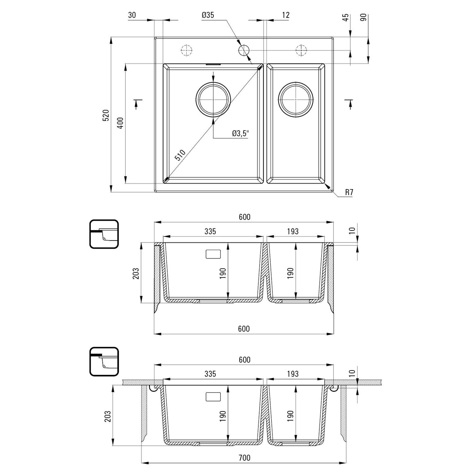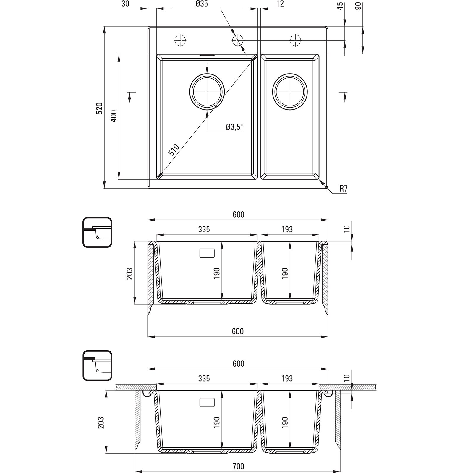 Obok standardowego otworu pod baterię zlewozmywak posiada specjalnie podfrezowane otwory, które mogą zostać wykorzystane przy instalacji automatycznego korka lub dozownika na płyn do naczyń.