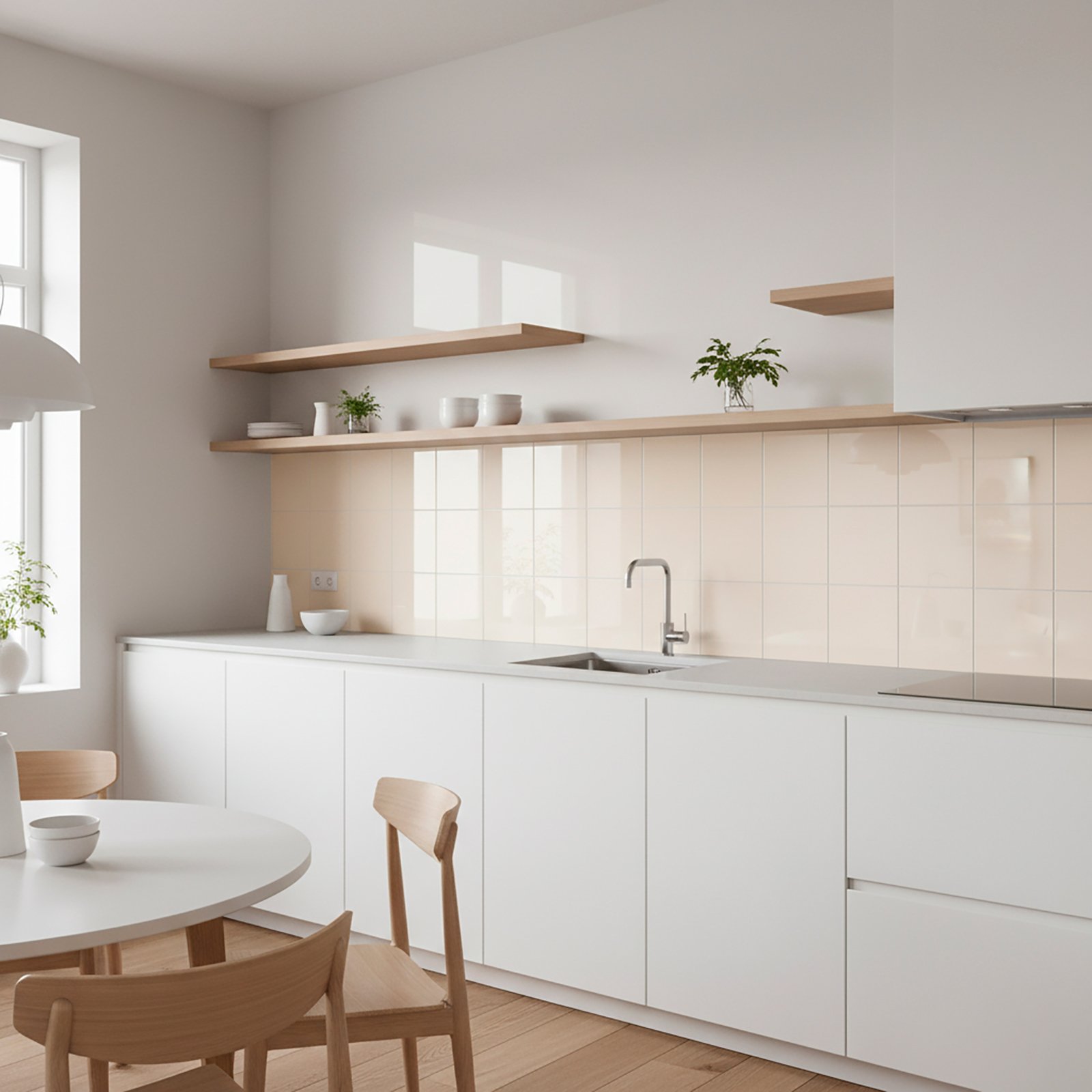 Błyszcząca kremowa płytka świetnie pasuje do wnętrz, które mają być jasne, eleganckie i ponadczasowe. Jej połysk pięknie łączy się z bielą i jasną szarością, tworząc świeży i lekki efekt. Zestawiona z drewnem wprowadza ciepło i naturalność, a z ciemniejszymi, matowymi elementami, jak grafit, antracyt czy czerń zyskuje nowoczesny, wyrazisty charakter. Doskonale komponuje się także z metalami takimi jak chrom, stal lub mosiądz, które podkreślają jej elegancki połysk. Dzięki swojej neutralności stanowi idealną bazę zarówno do klasycznych, jak i współczesnych aranżacji.