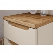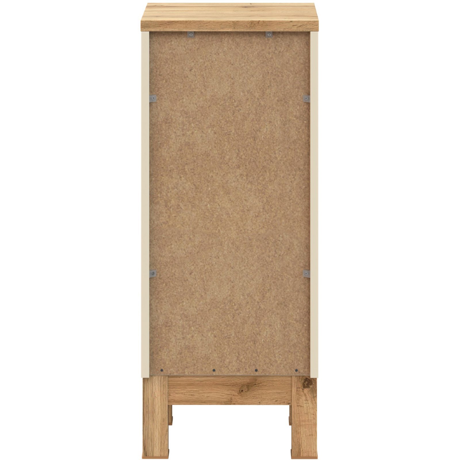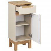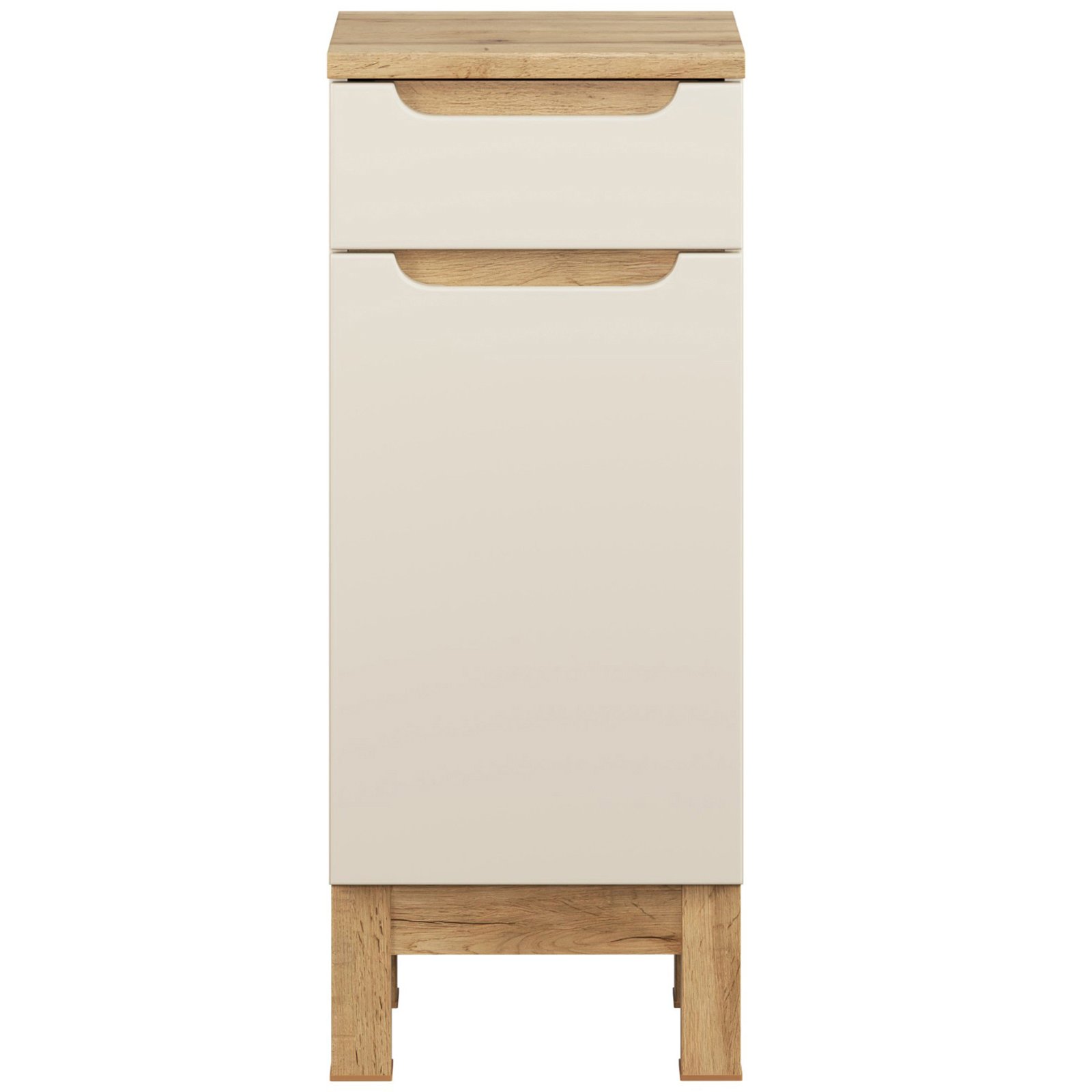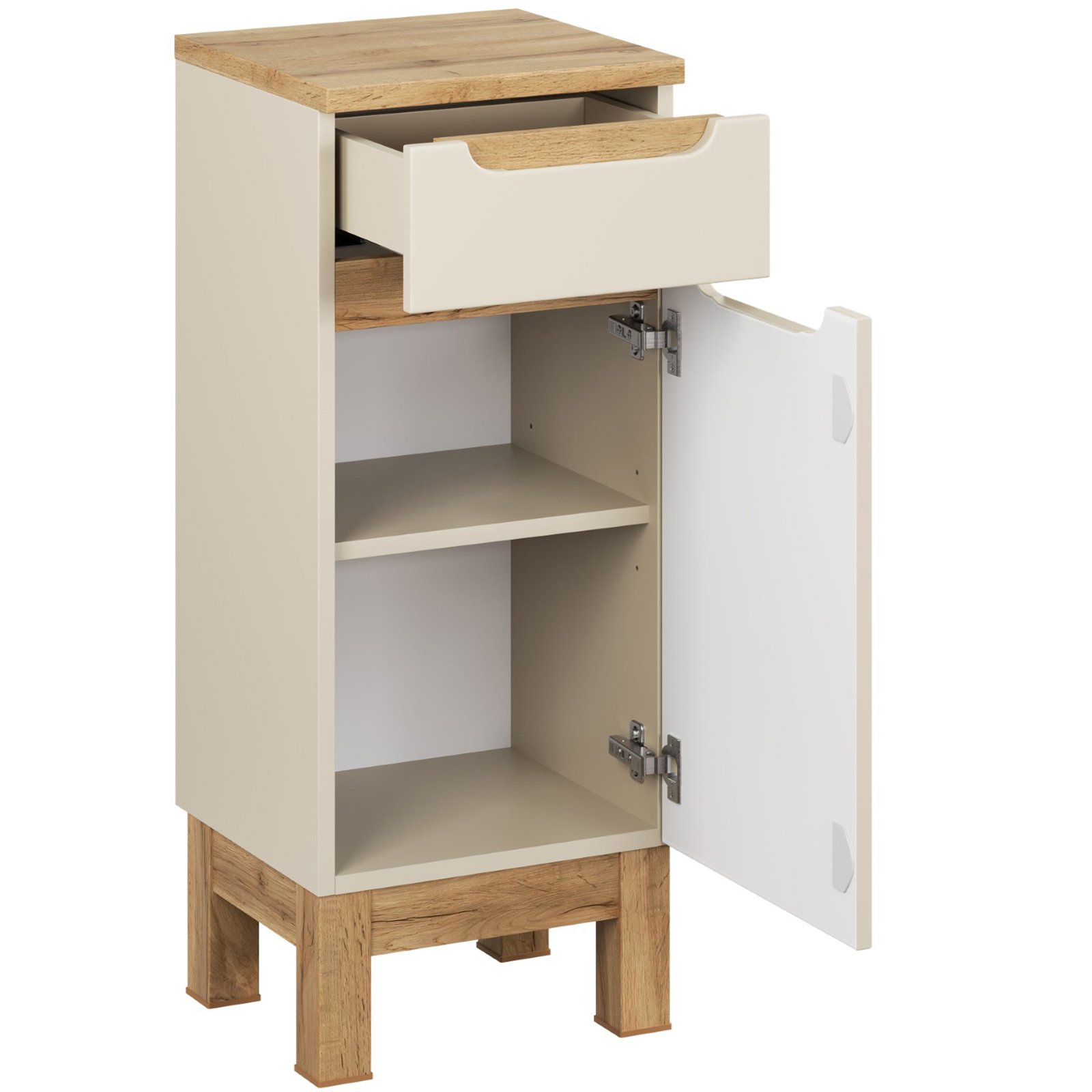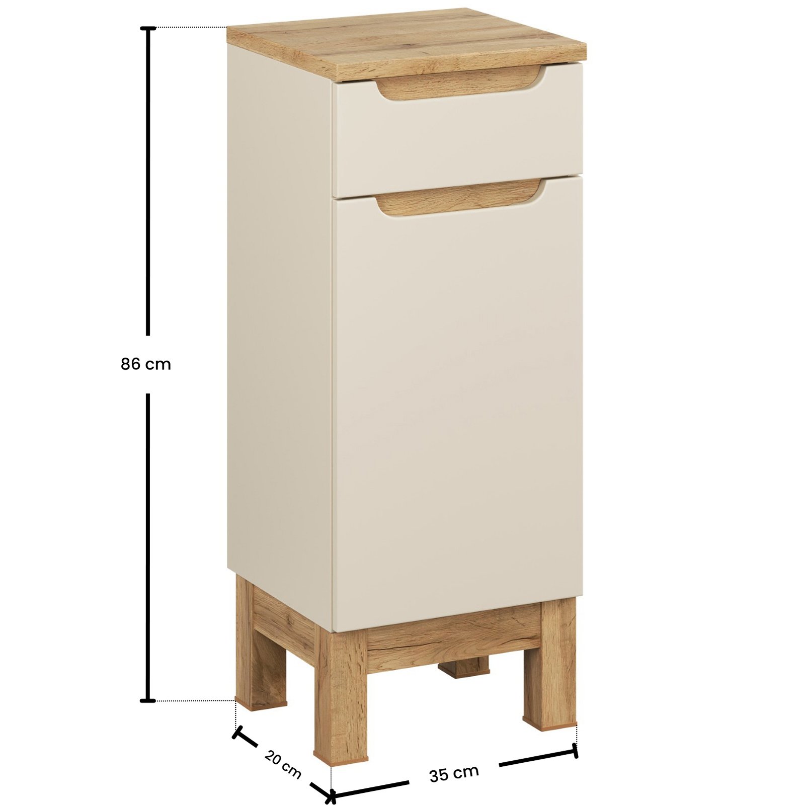 Półsłupek z kolekcji Bali Cashmere nadaje wnętrzu ciepła, tworząc przestrzeń, w której chce się zatrzymać na dłużej. Jasny dekor Kaszmirowy Beż w duecie z naturalnym dekorem Dąb Wotan tworzy spójną, elegancką całość. Dzięki dwóm pojemnym półkom i praktycznej szufladzie, szafka oferuje zaskakująco dużą przestrzeń do przechowywania w kompaktowej formie, zapewniając wygodną organizację przestrzeni w łazience. Meble wykonane z płyty MDF i płyty laminowanej zachwycają trwałością i estetyką na lata. Komfort codziennego użytkowania zapewnia system cichego domykania drzwi i szuflad.