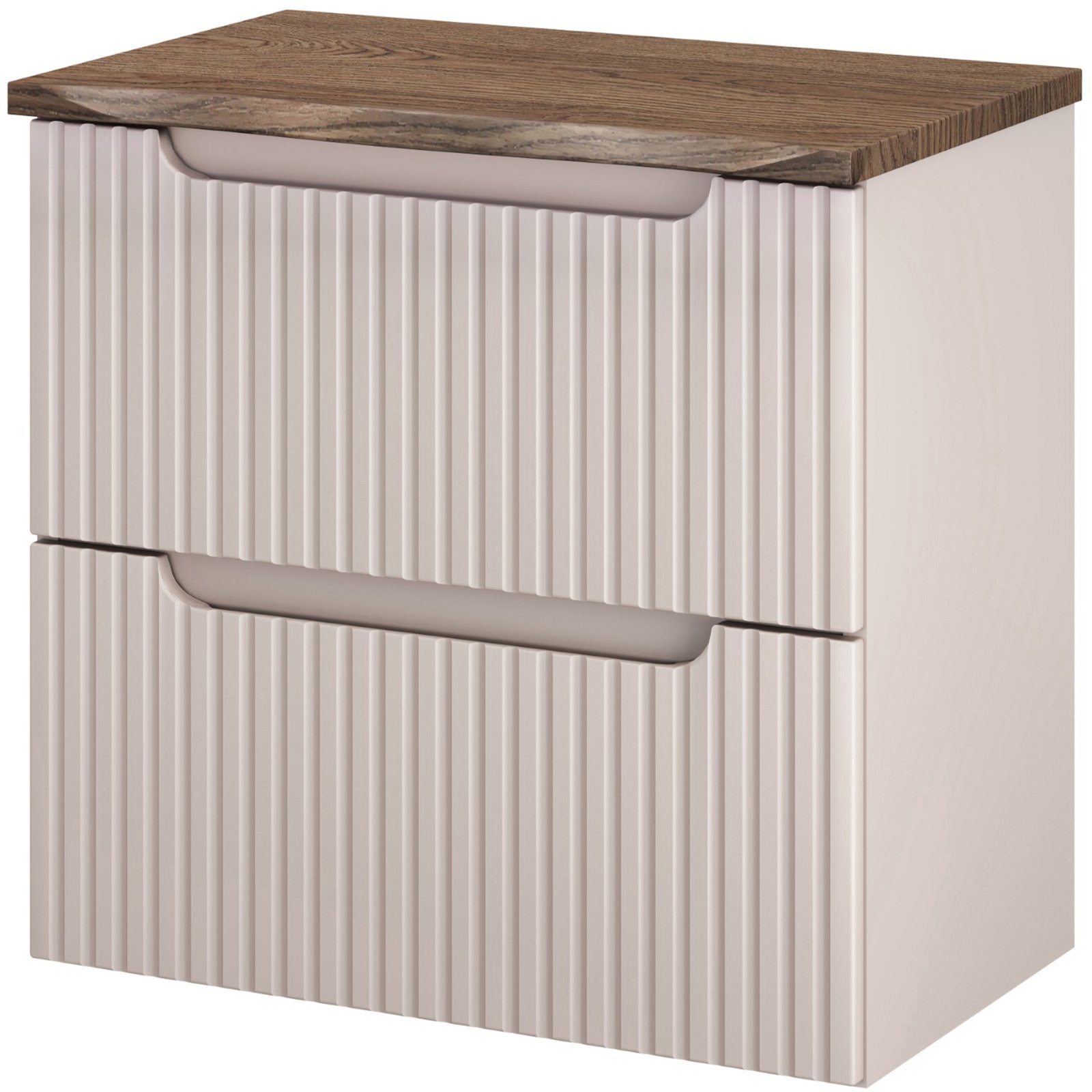 Kolekcja Nova Cashmere, łączy minimalistyczny design z funkcjonalnością. Pionowe, ryflowane fronty nadają meblom unikalny charakter i optycznie powiększają przestrzeń łazienki, a kaszmirowy kolor dodaje subtelnego ciepła, doskonale komponując się z różnorodnymi aranżacjami wnętrz. Blat z kolekcji Nature to propozycja inspirowana prawdziwym drewnem – jego nieregularna, lekko falowana krawędź imituje naturalnie cięty kawałek drewna, nadając wnętrzu autentyczny i przytulny klimat.