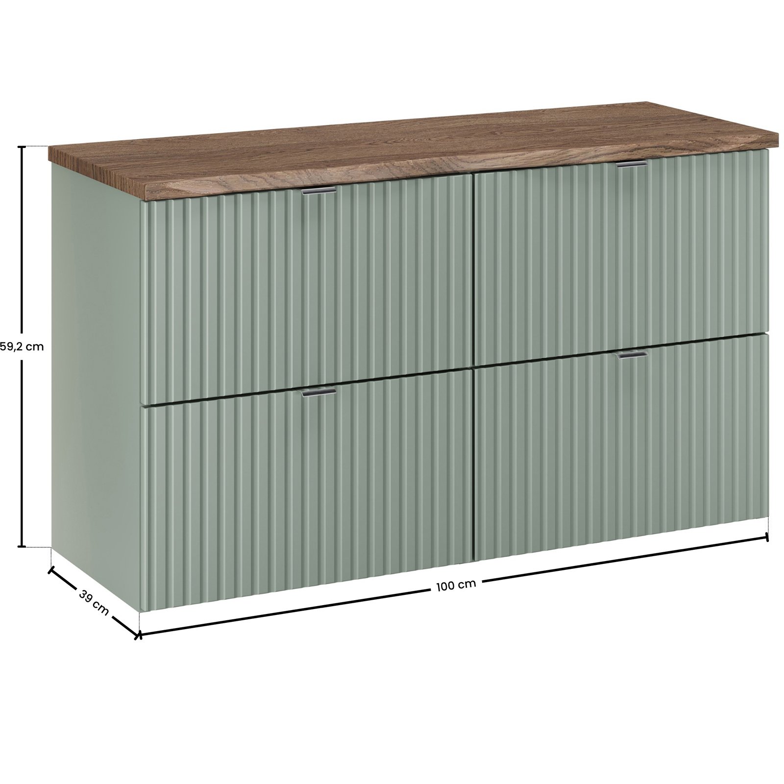 Zestaw mebli z kolekcji Line Reed Green to doskonała propozycja do łazienek, gdzie liczy się funkcjonalność i elegancja. Fronty szafki ozdobione są frezowanymi ryflami pionowymi, co dodaje im oryginalności. Uchwyty w kolorze srebrnym doskonale komponują się z całością, dodając subtelny akcent. Blat z kolekcji Nature to propozycja inspirowana prawdziwym drewnem – jego nieregularna, lekko falowana krawędź imituje naturalnie cięty kawałek drewna, nadając wnętrzu autentyczny i przytulny klimat.
